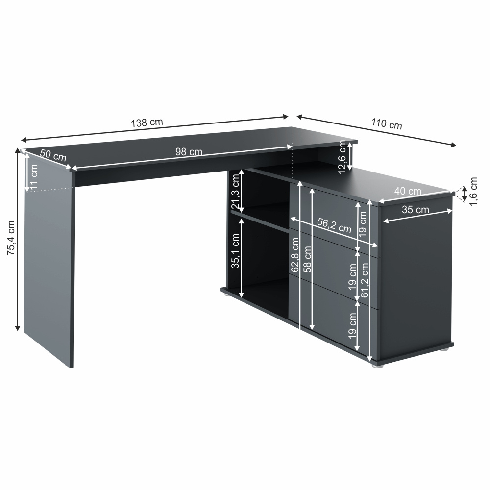 Materiál: DTD laminovaná Barva: grafit Rozměry (ŠxHxV): 138x50 / 110x75,4 cm Tloušťka materiálu: 16 mm univerzální 3 šuplíky otevřená police Vhodný i do prostoru Z boku čielok zásuvek je přesah Kvalitní slovenský výrobek Dodávané v demontu
