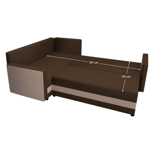 Materiál čalounění: látka Savana 17/16 Oděruodolnost textilie podle testu Martindale: 80 000 oděrů Barva čalounění: béžová/hnědá Rozměry (ŠxHxV): 214x144/71x73 cm Plocha na spaní (ŠxD): 115x197 cm Rozměry opěrky na ruku (ŠxH): 10x75 cm Výška sedu: 39 cm Hloubka sedu: 45/65 cm Na plastových nožičkách Barva nožiček: černá Výška spodního prostoru od podlahy: 2,5 cm Výplň: pur pěna Rozkládací Rohová Univerzální (L/P) S úložným prostorem Dodávána s pěti polštáři Rozměr polštářů (ŠxH): 64x46 cm Dodáváno v demontu