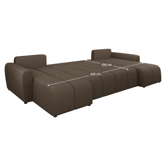 Materiál: látka Soro 28 Oděruodolnost textilie podle testu Martindale: 90 000 oděrů Barva: hnědá Rozměry (ŠxHxV): 307x138/138x73/82 cm Rozkládací Plocha na spaní (ŠxD): 108x265 cm Výška sedu: 39 cm Hloubka sedu: 45/65 cm Šířka sedáku: 131 cm Na nožičkách Materiál nožiček: plast Barva nožiček: černá Výška spodního prostoru od podlahy: 2,5 cm Výplň: PUR pěna T28 Univerzální provedení Tvar U Rohová S úložným prostorem Dodáváno s polštáři Rozměry opěrkového polštáře (ŠxV): 65x45 cm Dekorativně prošívaná Dodáváno v demontu
