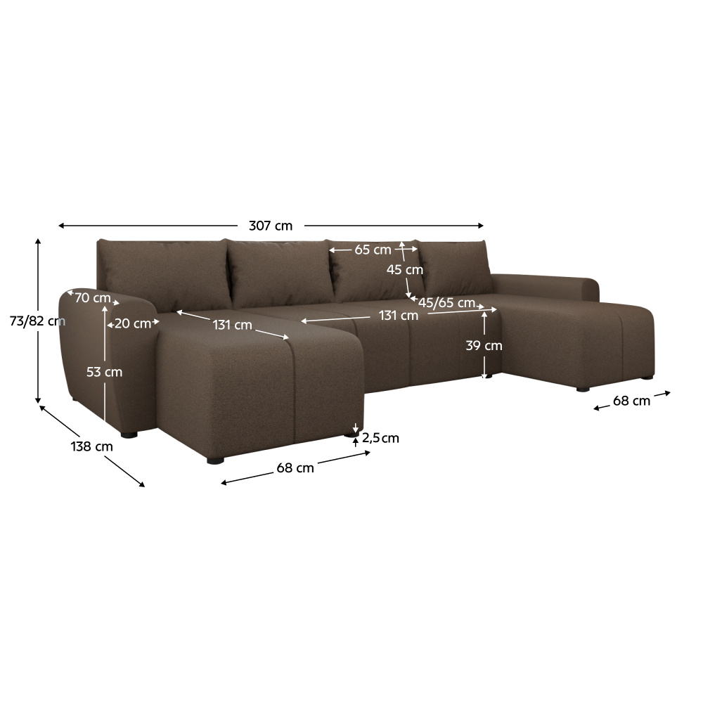 Materiál: látka Soro 28 Oděruodolnost textilie podle testu Martindale: 90 000 oděrů Barva: hnědá Rozměry (ŠxHxV): 307x138/138x73/82 cm Rozkládací Plocha na spaní (ŠxD): 108x265 cm Výška sedu: 39 cm Hloubka sedu: 45/65 cm Šířka sedáku: 131 cm Na nožičkách Materiál nožiček: plast Barva nožiček: černá Výška spodního prostoru od podlahy: 2,5 cm Výplň: PUR pěna T28 Univerzální provedení Tvar U Rohová S úložným prostorem Dodáváno s polštáři Rozměry opěrkového polštáře (ŠxV): 65x45 cm Dekorativně prošívaná Dodáváno v demontu