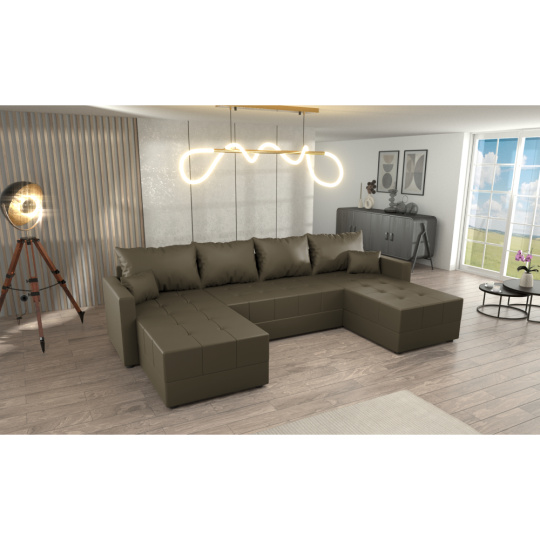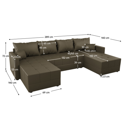 Materiál: látka Riviera 26 Oděruodolnost textilie podle testu Martindale: 90 000 oděrů Barva: hnědá Rozměry (ŠxHxV): 289x140/140x72 cm Rozkládací Plocha na spaní (ŠxD): 115x265 cm Výška sedu: 39 cm Hloubka sedu: 45/65 cm Šířka sedáku: 131 cm Šířka otomanu: 69 cm Na nožičkách Materiál nožiček: plast Barva nožiček: černá Výška spodního prostoru od podlahy: 2,5 cm Výplň: PUR pěna T28 Univerzální provedení Tvar U Rohová S úložným prostorem Dodáváno s polštáři Rozměry dekorativních polštářů (ŠxV): 45x30cm Rozměry opěrkového polštáře (ŠxV): 65x45 cm Dodáváno v demontu
