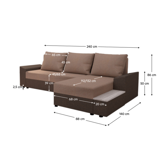 Materiál: látka Falcone16/25 Oděruodolnost textilie podle testu Martindale: 50 000 oděrů Provedení: hnědá/světle hnědá Rozměry (ŠxHxV): 240x140x86 cm Plocha na spaní (ŠxD): 120x200 cm Výška sedu: 39 cm Hloubka sedu: 45/65 cm Rozměr polštáře (ŠxV): 65x45 cm Rozměry opěrky na ruku (ŠxV): 20x50 cm Výška spodního prostoru od podlahy: 2,5 cm Výplň: Pur pěna Materiál nožiček: plast Barva nožiček: černá Univerzální (L/P) Celočalouněná Rohová Rozkládací S úložným prostorem S polštáři Barová deska Dodáváno v demontu.