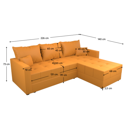 Materiál: látka Riviera 41 Oděruodolnost textilie podle testu Martindale: 90 000 oděrů Barva: hořčicová Rozměry (ŠxHxV): 226x140x73 cm Rozkládací Plocha na spaní (ŠxD): 119x199 cm Výška sedu: 39 cm Hloubka sedu: 45/65 cm Šířka sedáku: 131 cm Šířka otomanu: 68 cm Na nožičkách Materiál nožiček: plast Barva nožiček: černá Výška spodního prostoru od podlahy: 2,5 cm Výplň: PUR pěna T28 Univerzální provedení Rohová S úložným prostorem Dodáváno s polštáři Rozměry dekorativních polštářů (ŠxV): 45x30cm Rozměry opěrkového polštáře (ŠxV): 65x45 cm Dodáváno v demontu