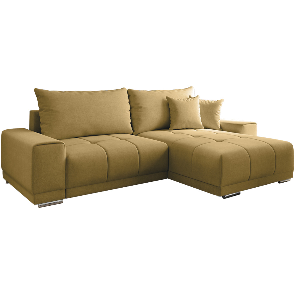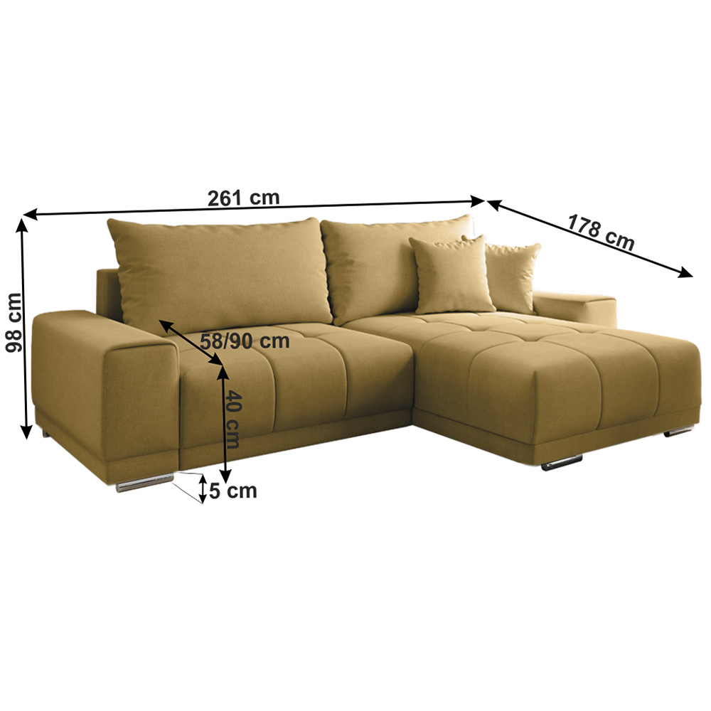 Materiál: látka SORO Oděruodolnost textilie podle testu Martindale: 90 000- 100 000 oděrů Provedení: 40 hořčicová Rozměry (ŠxHxV): 261x178x98 cm Plocha na spaní (ŠxD): 148x203 cm Výška sedu: 40 cm Hloubka sedu: 58/90 cm Výška spodního prostoru od podlahy: 5 cm celočalouněná Univerzální (L / P) rohová rozkládací S úložným prostorem dekorativní prošívaná S polštáři Pružina faliste / pur pěna Dodávané v demontu.