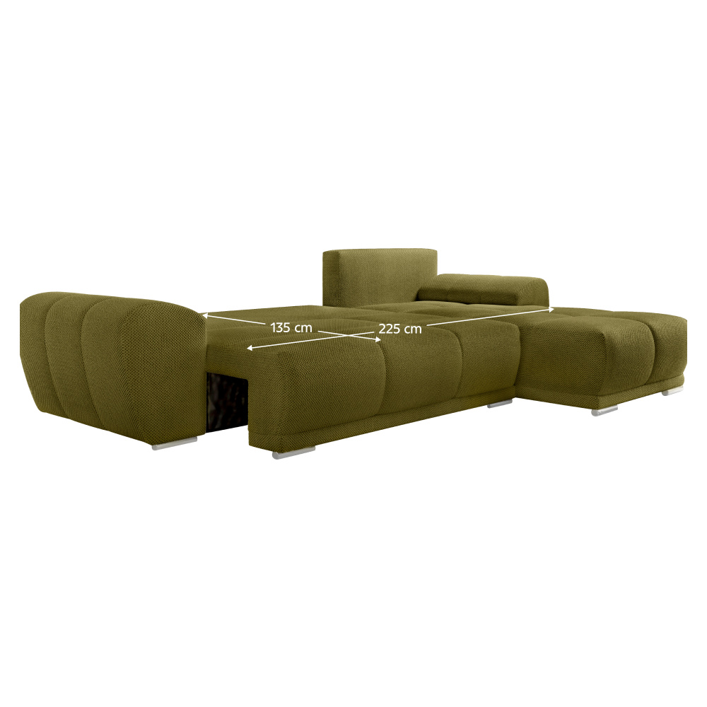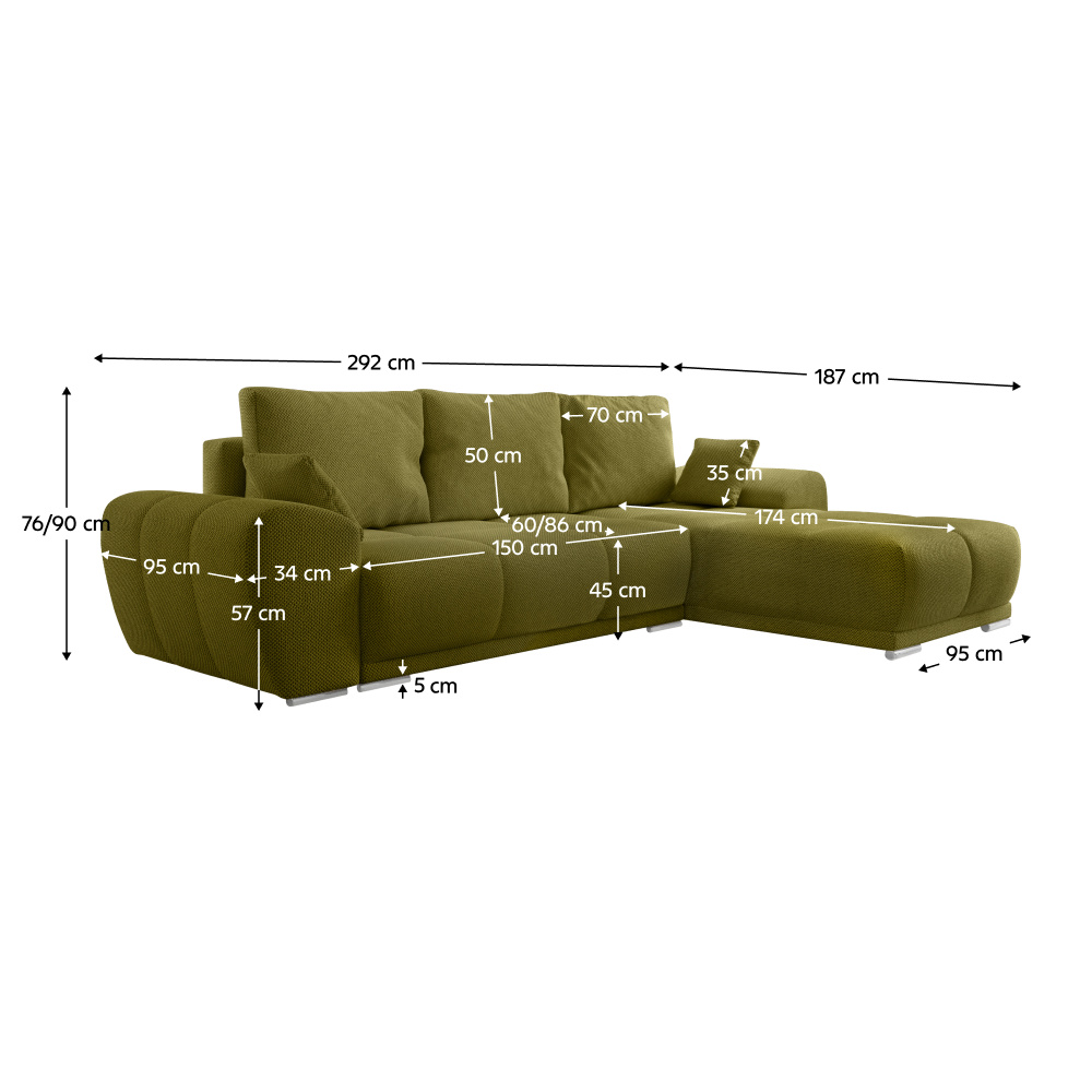 Materiál: látka Curio 35 Oděruodolnost textilie podle testu Martindale: 60 000 oděrů Barva: olivová Rozměry (ŠxHxV): 292x187x76/90 cm Plocha na spaní (ŠxD): 135x225 cm Výška sedu: 44 cm Hloubka sedu: 60/86 cm Rozměry otomanu (ŠxH): 95x174 cm Rozměry opěrky na ruku (ŠxHxV): 34x95x57 cm Šířka sedáku: 150 cm Univerzální Celočalouněná Rozkládací Rohová S úložným prostorem Na nožičkách Materiál nožiček: plast Barva nožiček: stříbrná Výška spodního prostoru od podlahy: 5 cm Výplň: pružina falista/pur pěna S polštáři Rozměry polštářů (ŠxV): 70x50 cm Rozměry dekorativních polštářů (ŠxV): 35x35 cm Praktická Moderní Dodáváno v demontu Nabízíme vám možnost vybrat si ze 6 barevných provedení látky Curio za cenu 27 490 Kč. Po uhrazení zálohy bude Váš požadavek zadán do výroby. Dodací lhůta 6-8 týdnů.