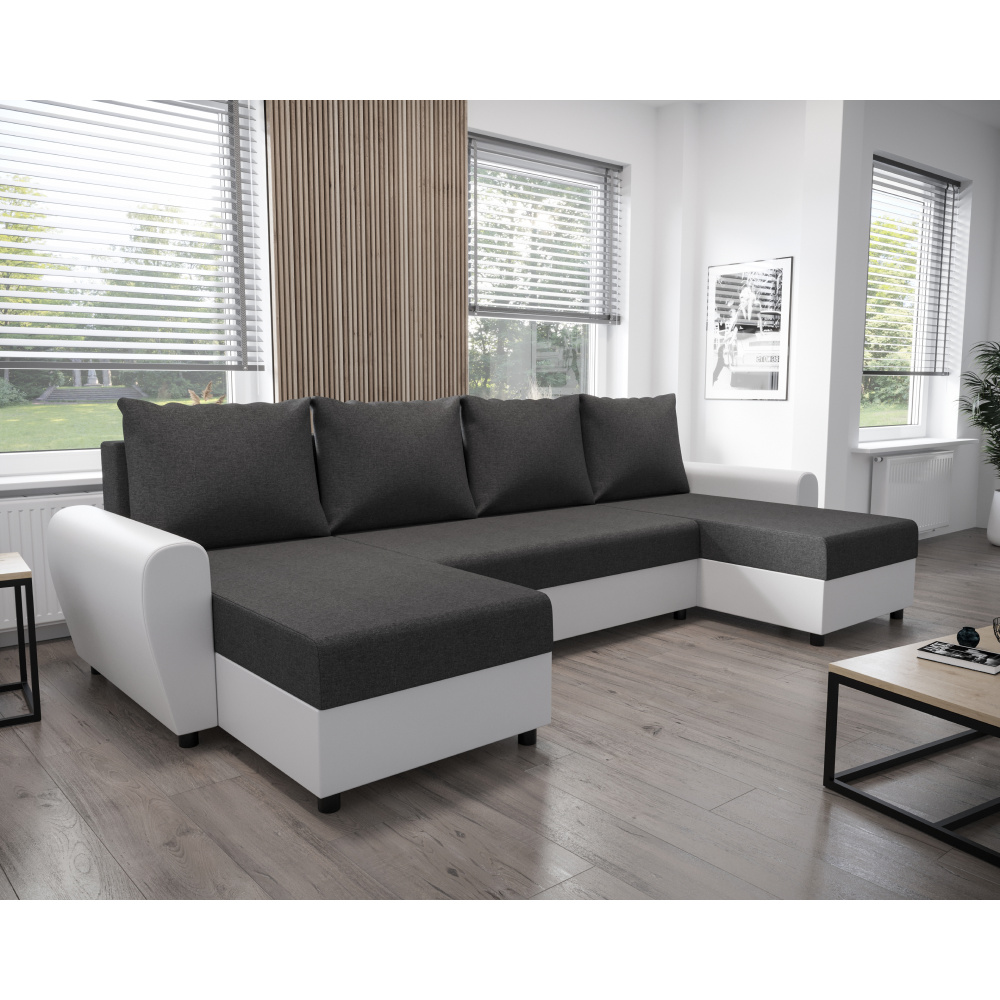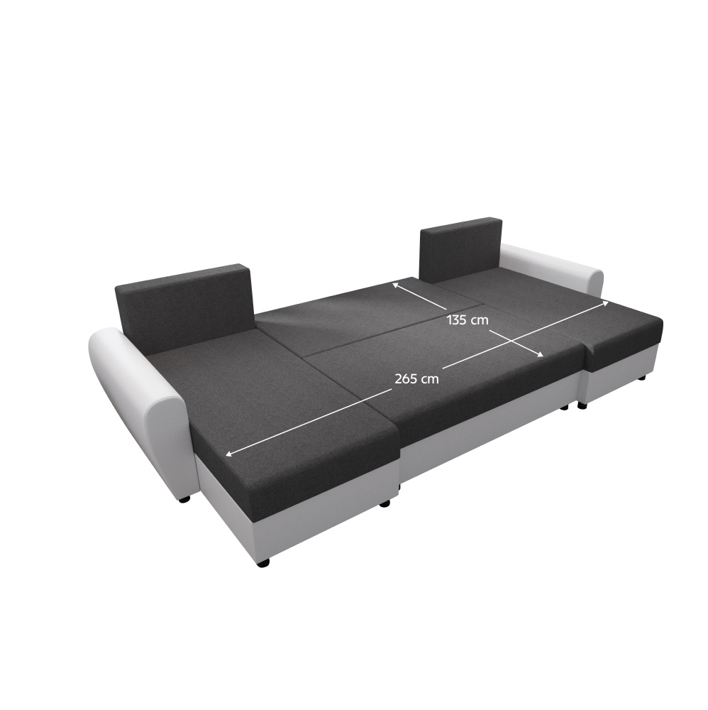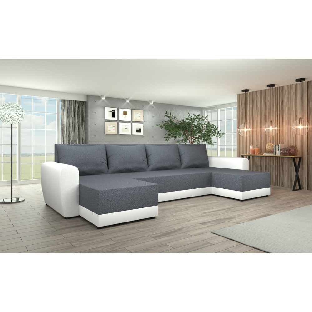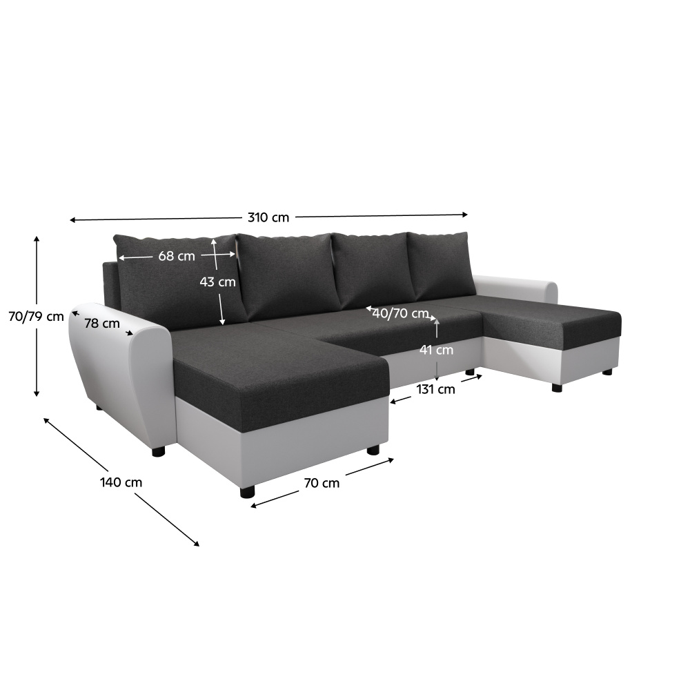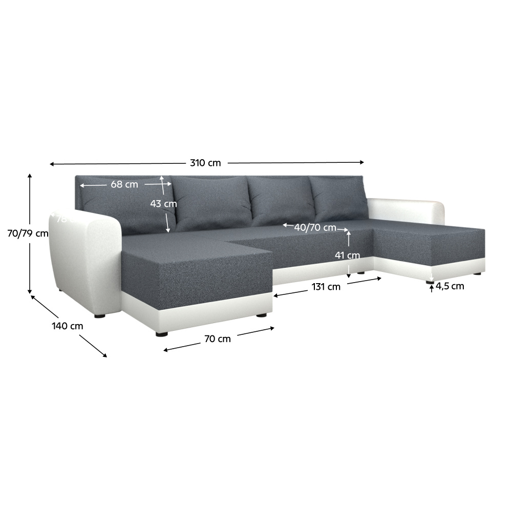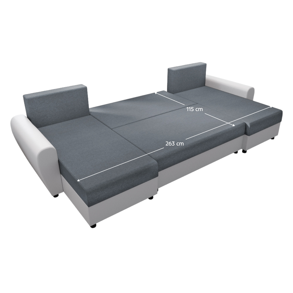 Materiál: látka Twist 20/ekokůže D511 Oděruodolnost látky podle testu Martindale: 45 000 oděrů Oděruodolnost ekokůže podle testu Martindale: 100 000 oděrů Barva: šedá/bílá Rozměry (ŠxHxV): 320x138/138x73/75 cm Plocha na spaní (ŠxD): 115x263 cm Výška sedu: 38,5 cm Hloubka sedu: 44/63 cm Hloubka otomanu bez polštářů: 131 cm Na plastových nožičkách Barva nožiček: černá Výška spodního prostoru od podlahy: 2,5 cm Výplň: pur pěna T28 Rozkládací Univerzální Tvar U S úložným prostorem Dodávána s polštáři Rozměr polštářů (ŠxH): 65x48 cm Dodáváno v demontu