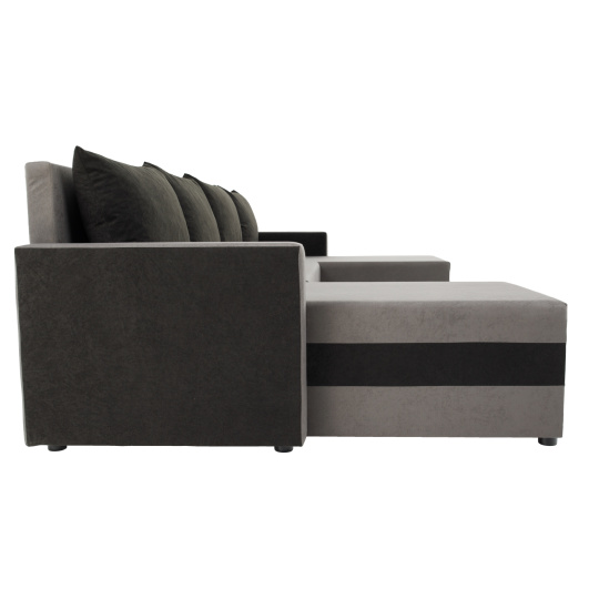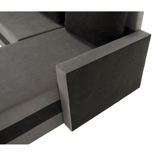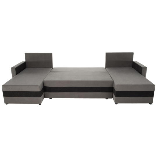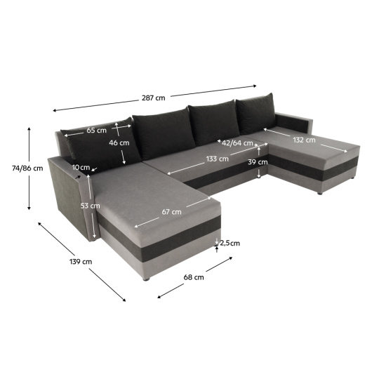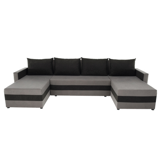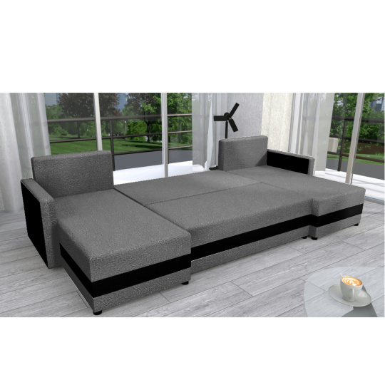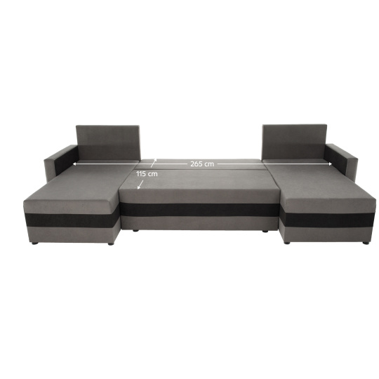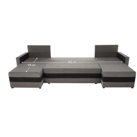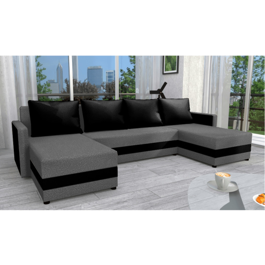 Materiál čalounění: látka Alova 36/04 Oděruodolnost textilie podle testu Martindale: 85 000 oděrů Barva čalounění: šedá/černá Rozměry (ŠxHxV): 287x139/139x74/86 cm Plocha na spaní (ŠxD): 115x265 cm Výška sedu: 39 cm Hloubka sedu: 42/64 cm Dodávána s polštáři Rozměr polštáře (ŠxV): 65x46 cm Šířka otomanů: 67 cm Opěrka na ruku (ŠxV): 10x54 cm Výška spodního prostoru od podlahy: 2,5 cm Výplň: Pur pěna T28 Tvar U Rozkládací Rohová Univerzální (L/P) S úložným prostorem v stredove části Dodáváno v demontu