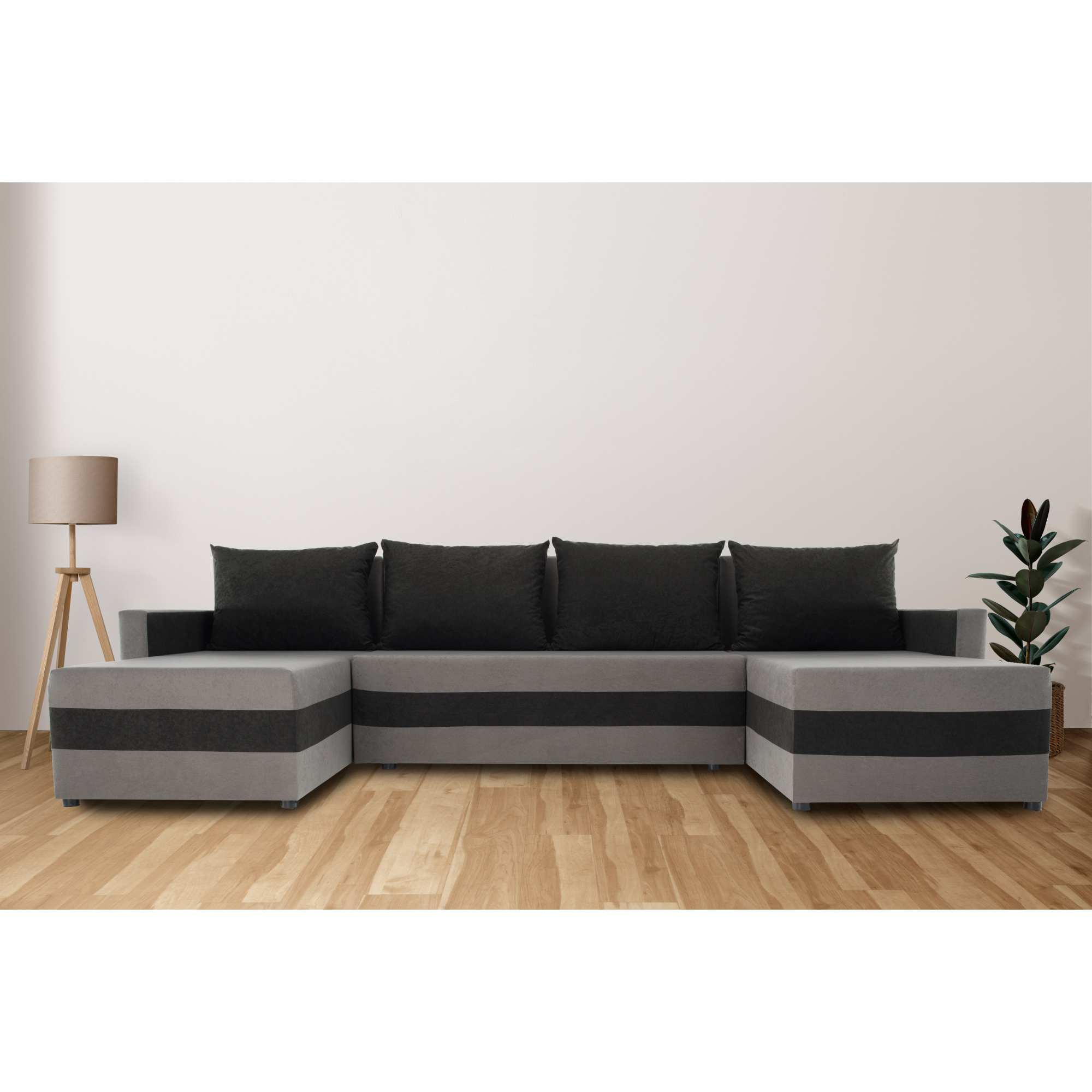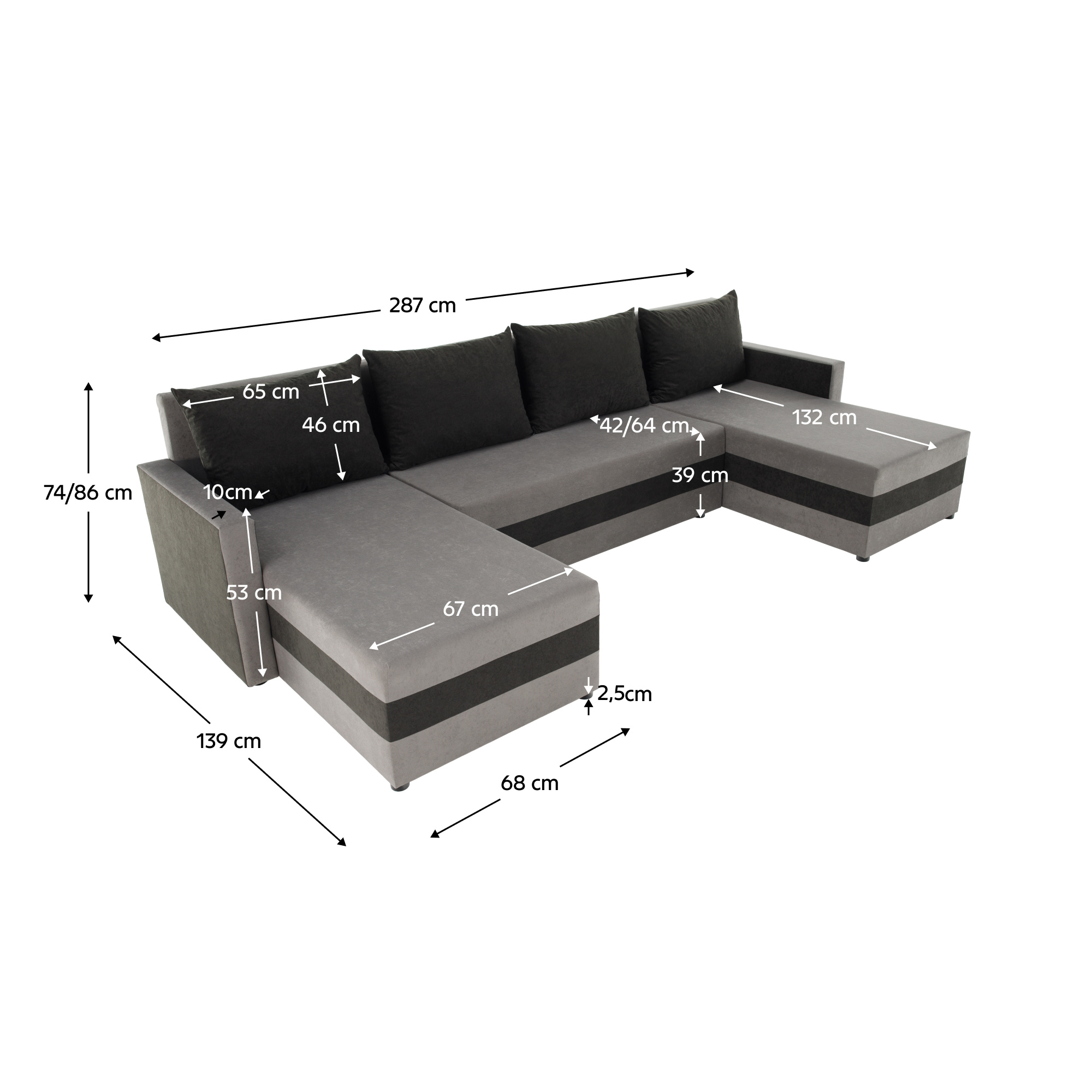 Materiál čalounění: látka Alova 36/04 Oděruodolnost textilie podle testu Martindale: 85 000 oděrů Barva čalounění: šedá/černá Rozměry (ŠxHxV): 287x139/139x74/86 cm Plocha na spaní (ŠxD): 115x265 cm Výška sedu: 39 cm Hloubka sedu: 42/64 cm Dodávána s polštáři Rozměr polštáře (ŠxV): 65x46 cm Šířka otomanů: 67 cm Opěrka na ruku (ŠxV): 10x54 cm Výška spodního prostoru od podlahy: 2,5 cm Výplň: Pur pěna T28 Tvar U Rozkládací Rohová Univerzální (L/P) S úložným prostorem v stredove části Dodáváno v demontu