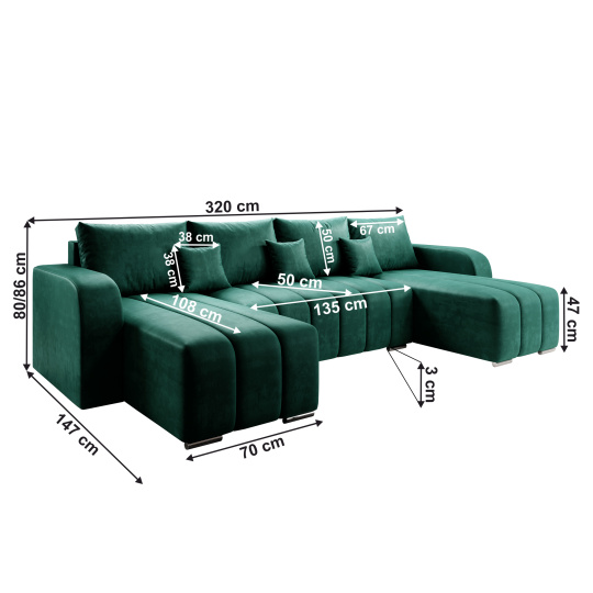 Materiál čalounění: Monolith 85 Oděruodolnost látky podle testu Martindale: 100 000 Barva čalounění: šedá Rozměry (ŠxHxV): 320x147/147x86 cm Plocha na spaní (ŠxD): 130x275 cm Výška sedu: 47 cm Hloubka sedu: 50 cm Šířka otomanů: 70 cm Šířka sedáku: 135 cm Šířka opěrky na ruku: 20 cm Na nožičkách Materiál nožiček: plast Barva nožiček: stříbrná Výška spodního prostoru od podlahy: 3 cm Nosnost na osobu: 90 kg Výplň: bonelová pružina+Pur pěna Rozkládací Celočalouněná Univerzální Dekorativní prošití Voděodolný materiál S úložným prostorem Dodávána s polštáři 4 velké polštáře 3 malé polštáře Rozměry velkých polštářů (ŠxV): 67x50 cm Rozměry malých polštářů (ŠxV): 38x38 cm Dodáváno v demontu