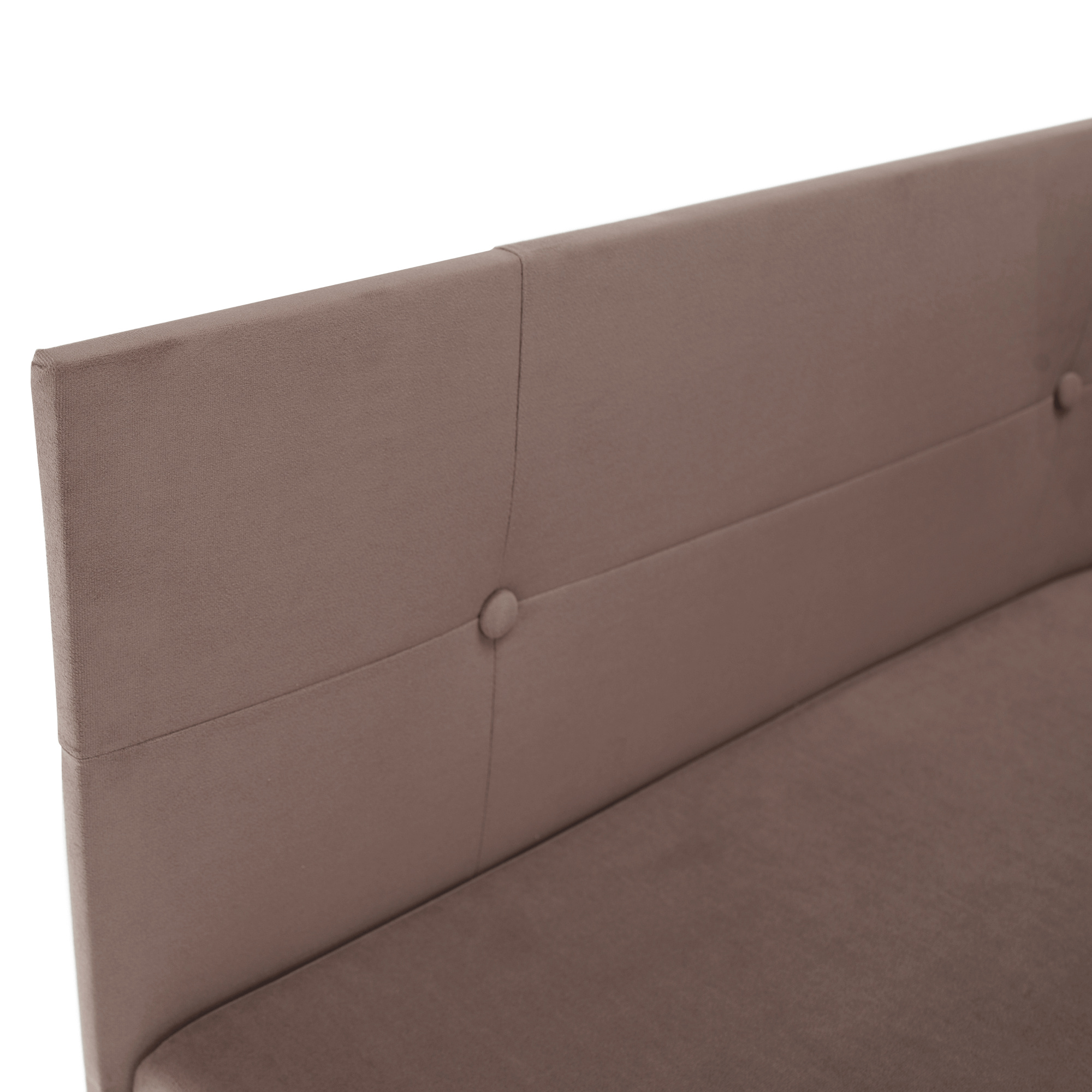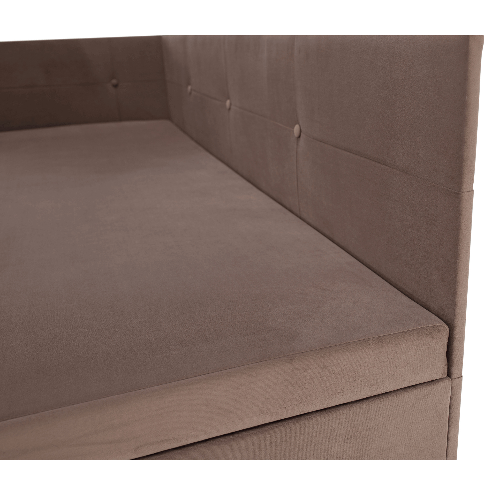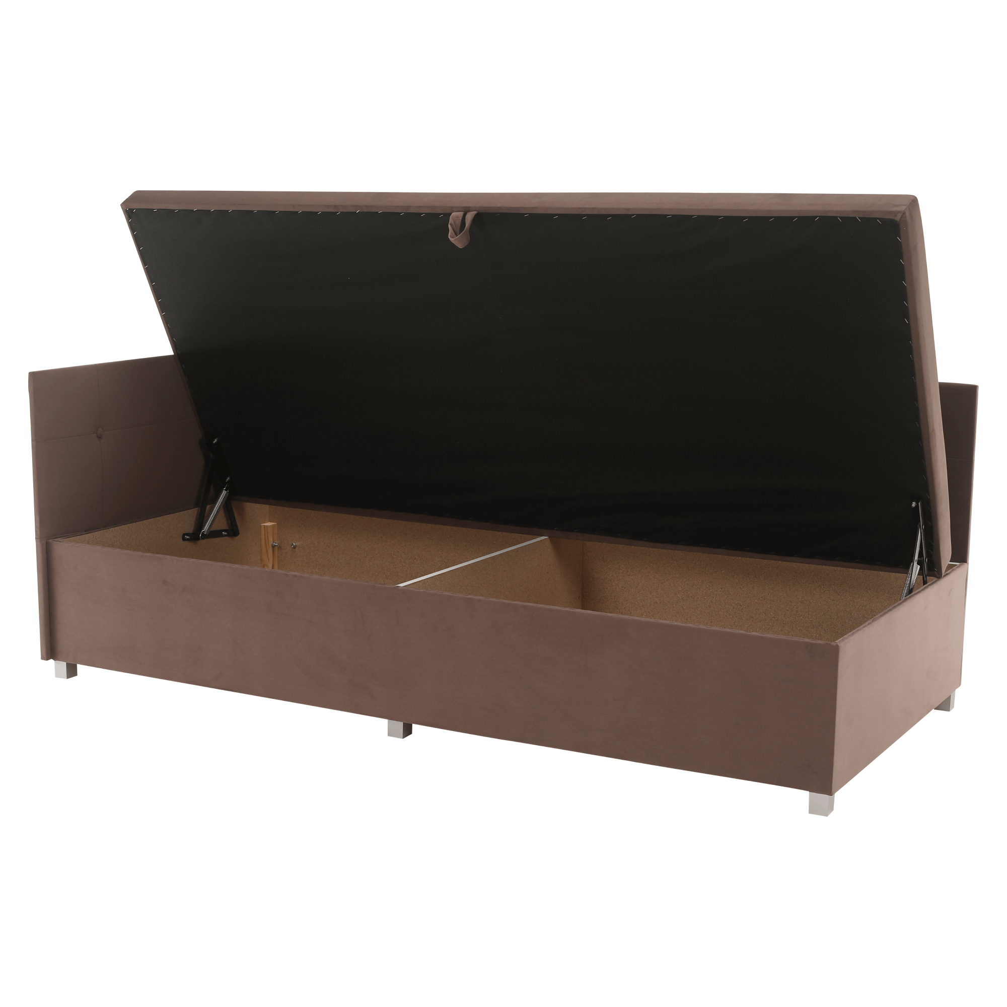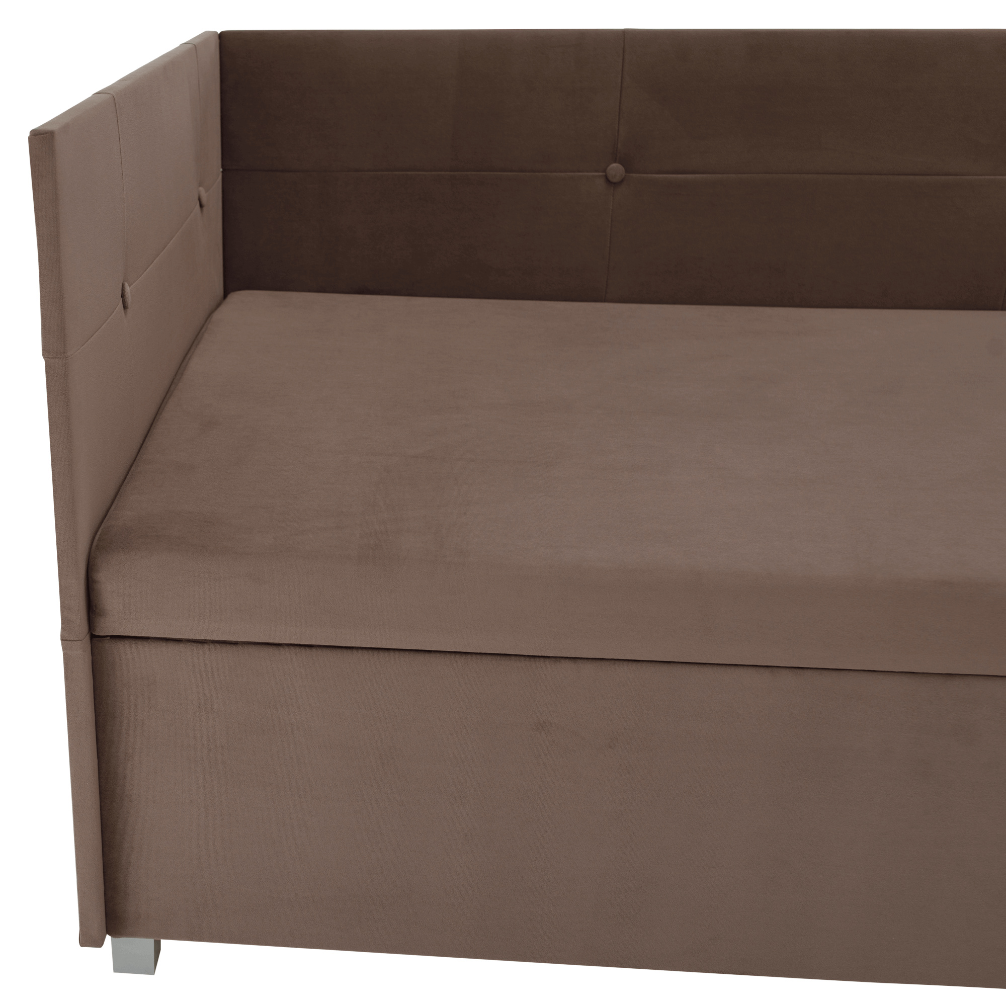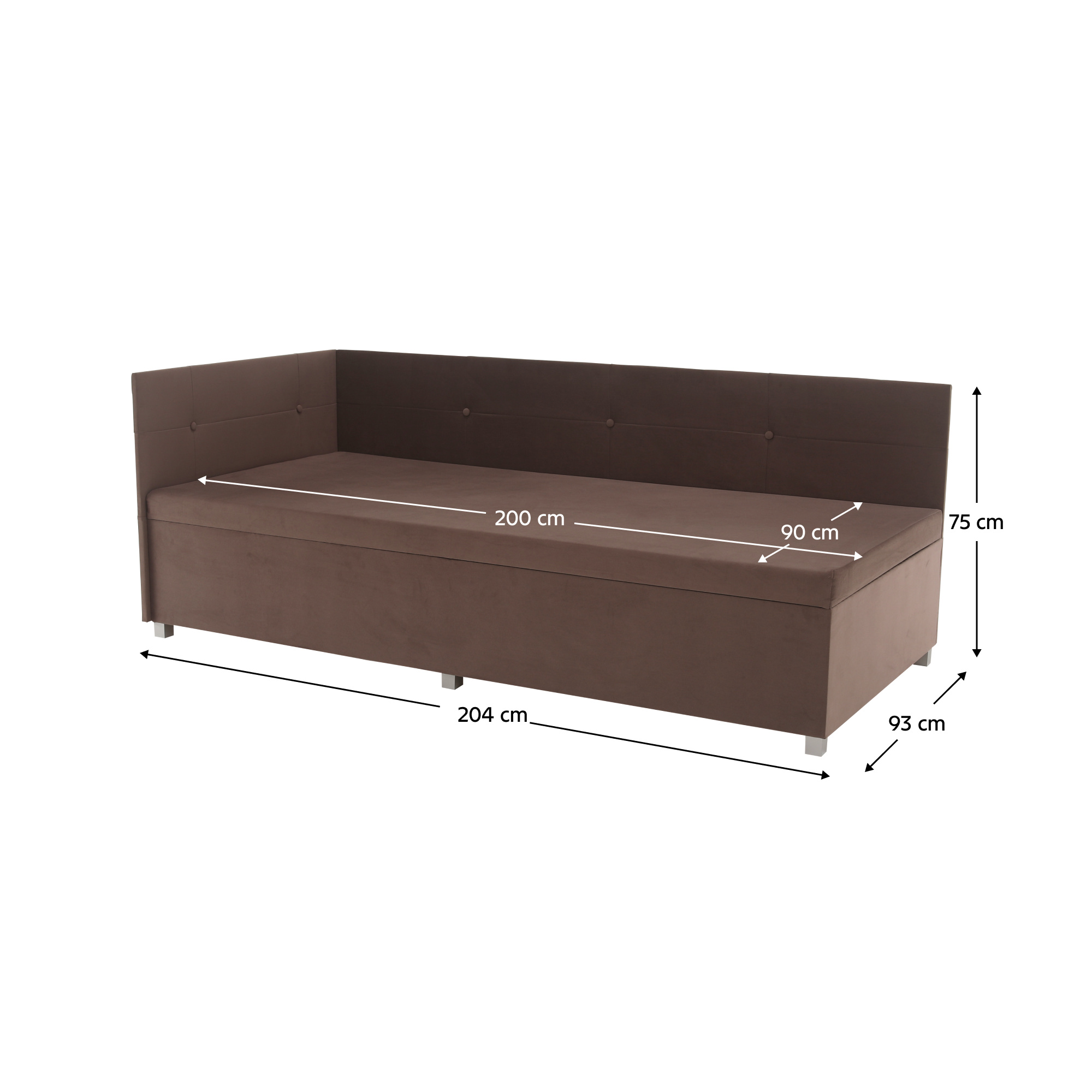 Materiál: DTD laminovaná/látka Trinity 06 Oděruodolnost textilie podle testu Martindale: 210 000 oděrů Jádro válendy: pur pěna T28 Barva: hnědá Taupe Rozměry (ŠxHxV): 93x204x75 cm Plocha na spaní (ŠxD): 90x200 cm Výška od země po matraci: 42 cm Nosnost: 110 kg Tvrdost matrace: H3 Univerzální Úložný prostor Boční výklopný mechanismus Vysoké čelo Praktická boční čela Čela zabraňující odření stěny Prošívaná čela Dekorativní knoflíky Dodáváno v demontu
