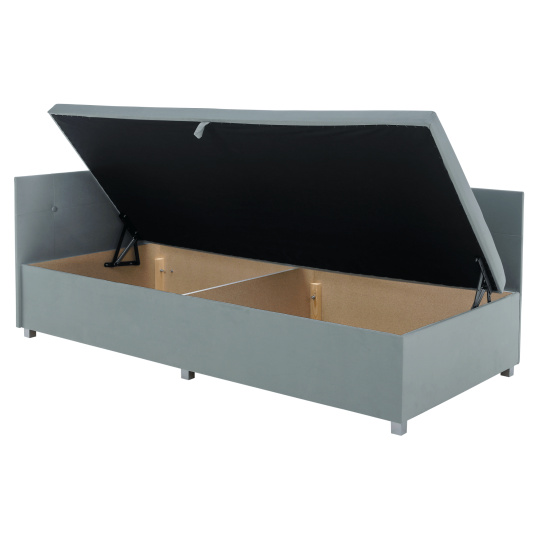 Materiál: DTD laminovaná/látka Trinity 21 Oděruodolnost textilie podle testu Martindale: 210 000 oděrů Jádro válendy: pur pěna T28 Barva: mentolová Rozměry (ŠxHxV): 93x204x75 cm Plocha na spaní (ŠxD): 90x200 cm Výška od země po matraci: 42 cm Nosnost: 110 kg Tvrdost matrace: H3 Univerzální Úložný prostor Boční výklopný mechanismus Vysoké čelo Praktická boční čela Čela zabraňující odření stěny Prošívaná čela Dekorativní knoflíky Dodáváno v demontu