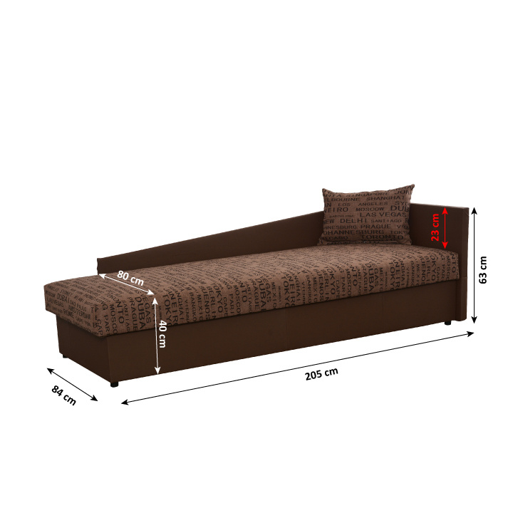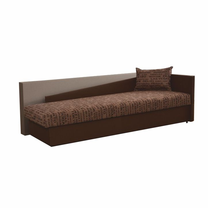 moderní válenda s úložným prostorem, P provedení, kvalitní bonelové sezení, materiál: ekokůže hnědá / látka vzor Vegas 3, Oděruodolnost textilie podle testu Martindale: 50 000 oděrek Oděruodolnost ekokůže podle testu Martindale: 100 000 oděrek rozměry: ŠxVxH: 205x63x84 cm, plocha na spaní: ŠxD: 80x200 cm, výška x hloubka sezení: 40x80 cm. Nosnost: 90 kg