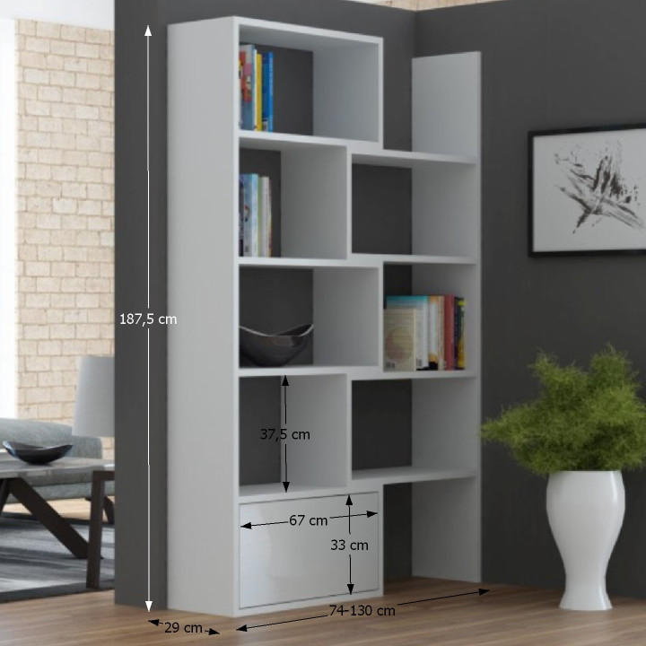 Moderní víceúčelový regálový systém KLOE II Materiál: DTD laminovaná Provedení: bílá Rozměry (ŠxHxV): 73-125x24x138 cm Dodávané v demontu. Hmotnost: 38.5kg