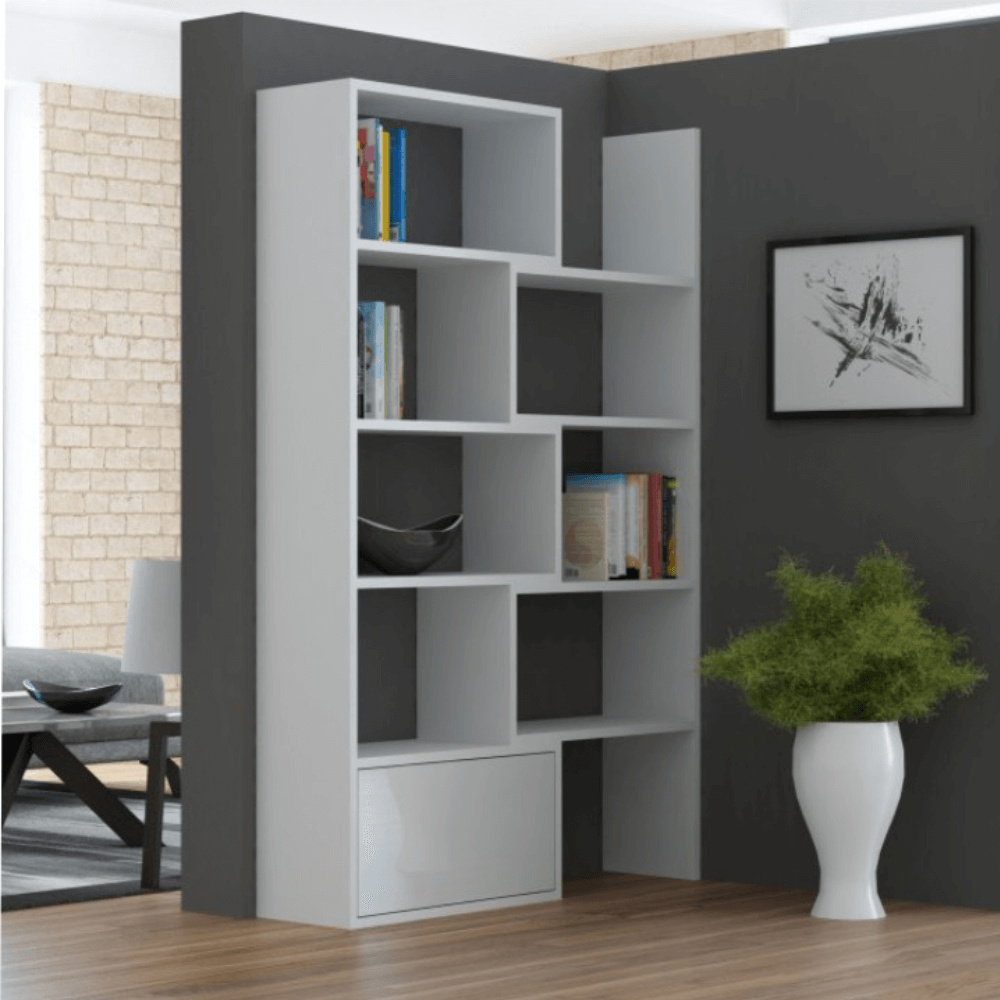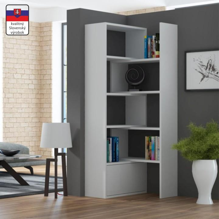 víceúčelový regál v moderním tvaru pyramidy s mnohostranným využitím. Vhodný do obývacího, dětského či studentského pokoje. Využijete ho ale hlavně v kanceláři, ve vaší pracovně, ale iv kuchyni. Je vyroben na Slovensku z kvalitní laminované dřevotřísky o síle lamina 16 mm. Je neutrální bílé barvy a rozměry jsou: ŠxVxH: 139x144x33 cm. Tlou