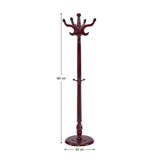 Materiál: břízové dřevo/MDF Barva: hnědá Rozměry (průměr x V): 42x181 cm Tloušťka materiálu stojanu: 3,2-5 cm S háčky Nosnost háčku: 5 kg S lesklým povrchem Praktický Moderní design Dodáváno v demontu