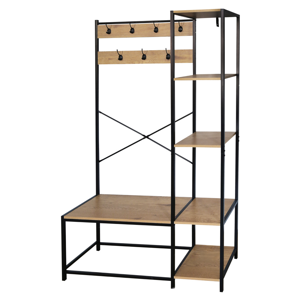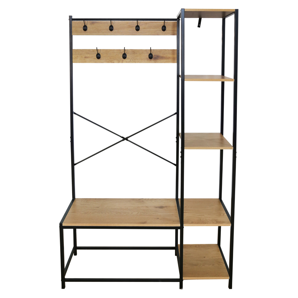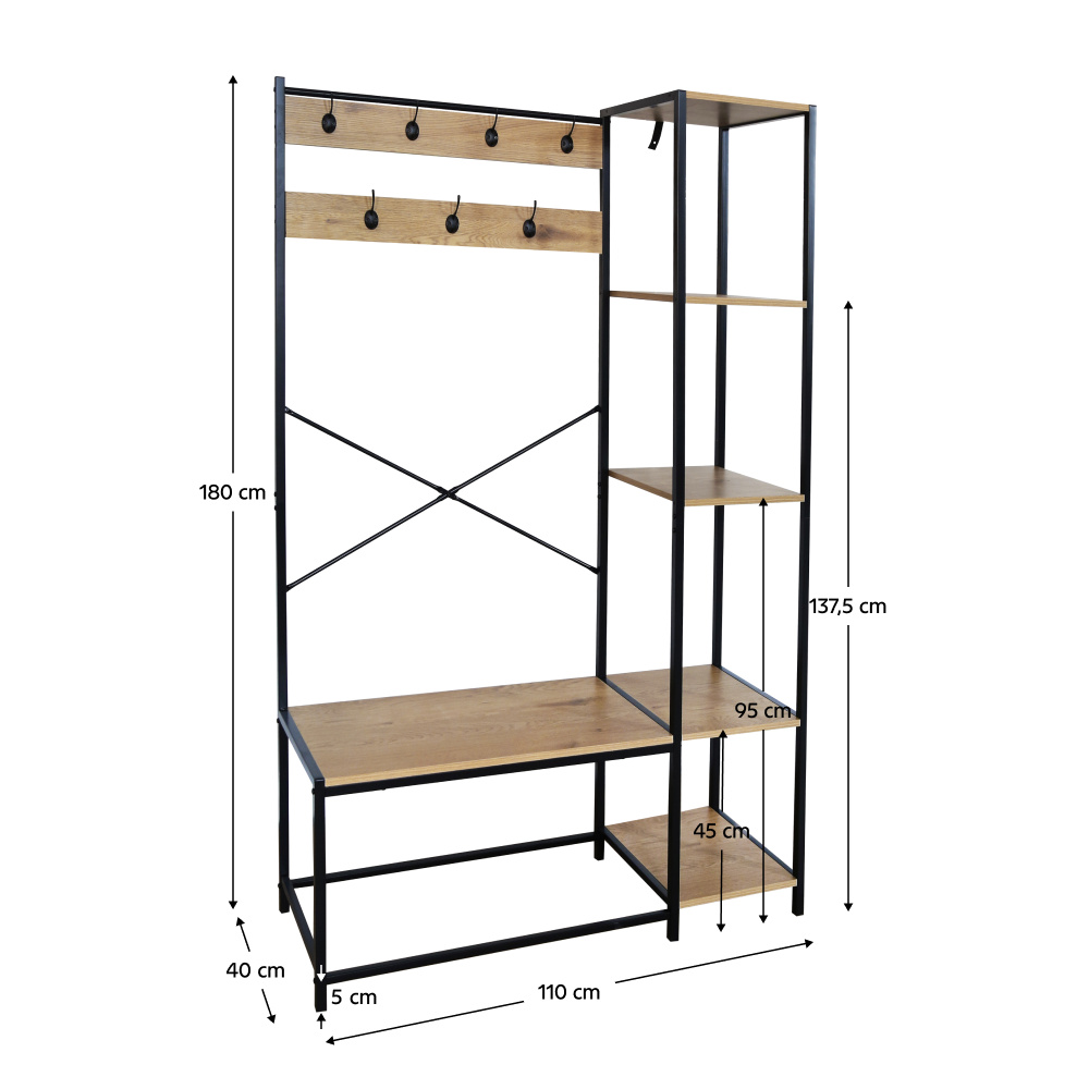 Materiál: kov/laminovaná MDF Barva: černá/dub Rozměry (ŠxHxV): 110x40x180 cm Tloušťka materiálu MDF: 1,5 cm Výška od země po spodní část police: 5 cm Sedm háčků Nosnost háčku: 4 kg Pět polic Nosnost malé police: 10 kg Nosnost velké police: 10 kg Industriální styl Jednoduchý Praktický Nevhodný k sezení Doporučujeme připevnit ke zdi Dodáváno v demontu