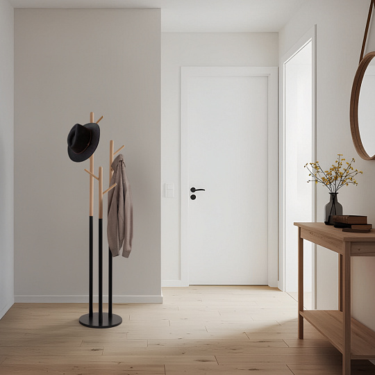 Materiál: kov/dřevo/mramor Barva: černá/přírodní Rozměry (PxV): 36x171 cm Průměr podstavy: 36 cm S háčky Nosnost háčku: Max. 2,5 kg Jednoduchý Praktický Dodáváno v demontu