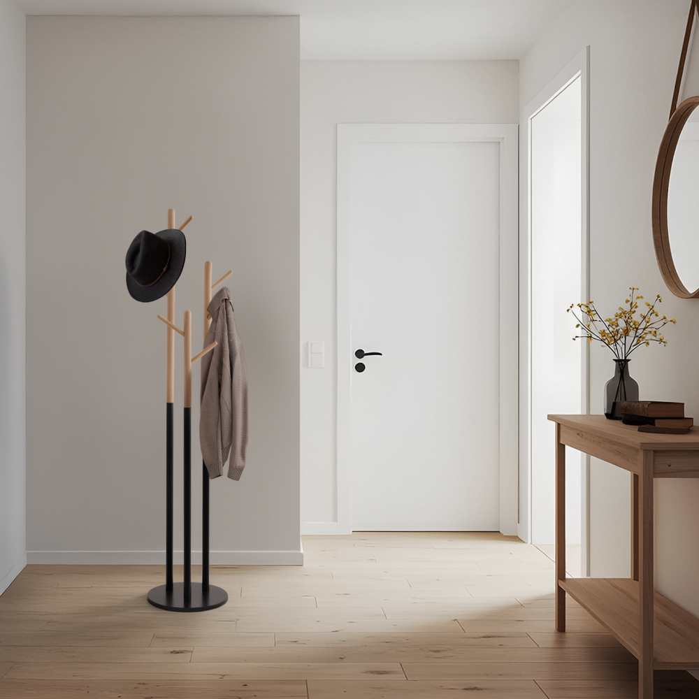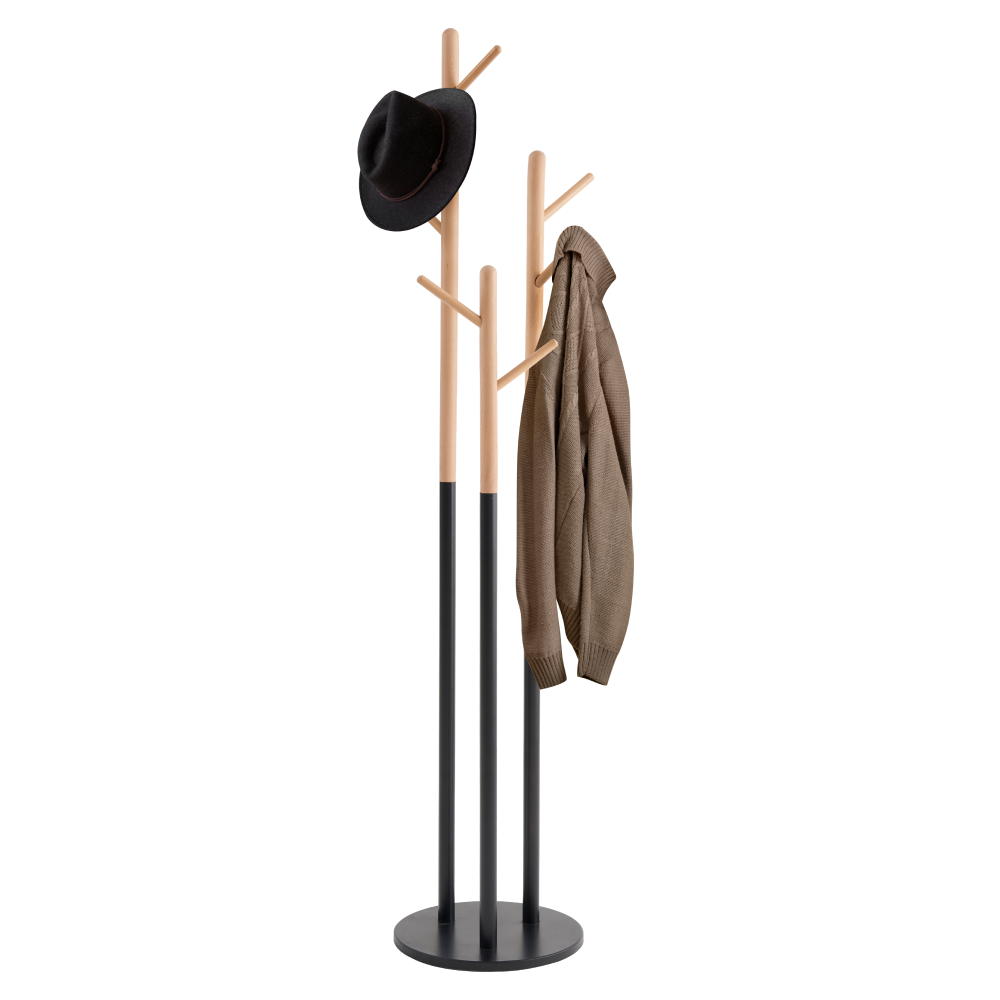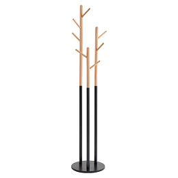 Materiál: kov/dřevo/mramor Barva: černá/přírodní Rozměry (PxV): 36x171 cm Průměr podstavy: 36 cm S háčky Nosnost háčku: Max. 2,5 kg Jednoduchý Praktický Dodáváno v demontu