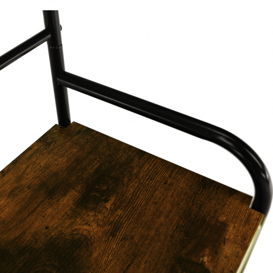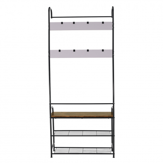 Materiál: kov / MDF Barva: černá / rustikální dřevo Rozměry (ŠxHxV): 79x32x185 cm Výška od země po spodní část police: 4,5 cm Rozměry police (ŠxV): 75x21,2 cm Tloušťka tyčí: 1,9 / 1,3 cm Nosnost na polici: 5 kg Nosnost na věšákovou část: 2 kg Nosnost lavice: 40 kg S háčky, věšákovou tyčí Dvě kovové police Dodávané v demontu