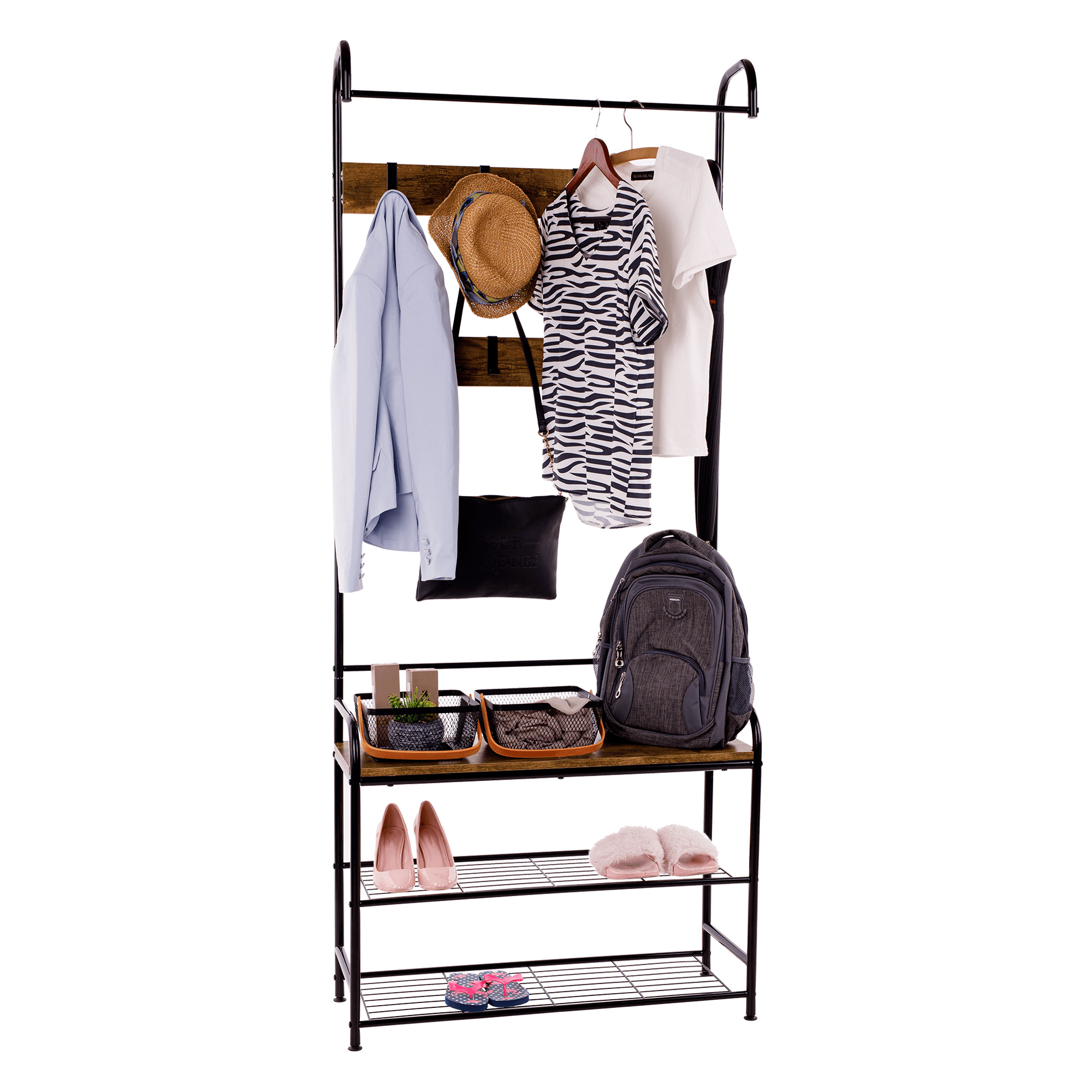 Věšák s botníkem, černý kov/MDFrustikální dřevo, KELAM
