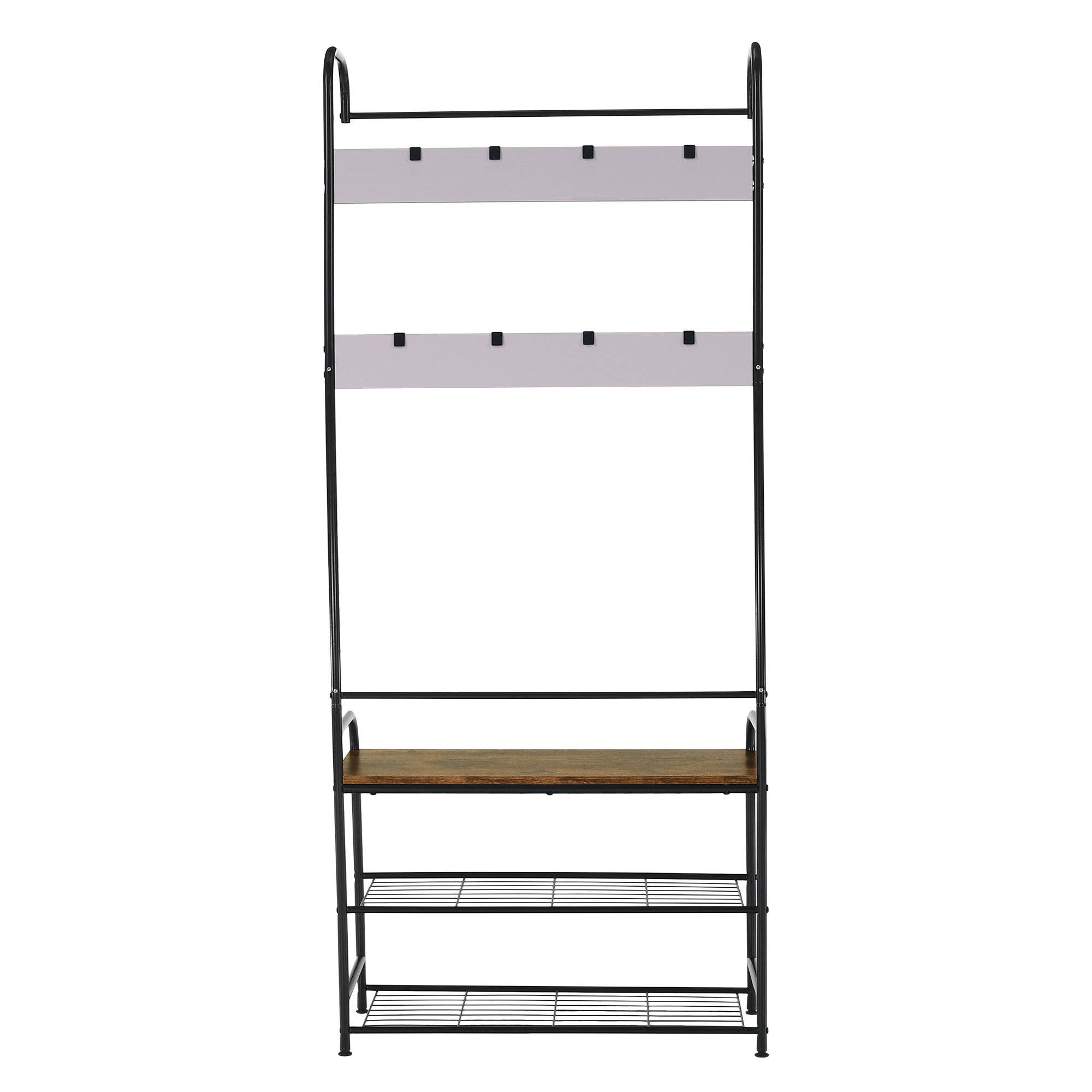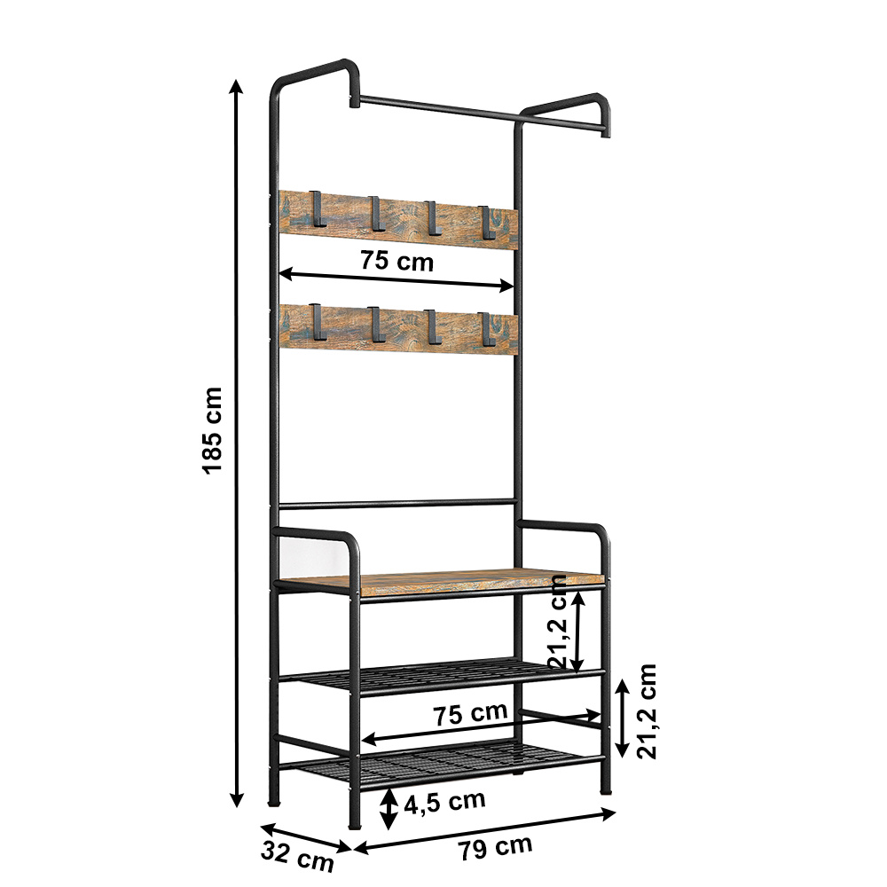 Materiál: kov / MDF Barva: černá / rustikální dřevo Rozměry (ŠxHxV): 79x32x185 cm Výška od země po spodní část police: 4,5 cm Rozměry police (ŠxV): 75x21,2 cm Tloušťka tyčí: 1,9 / 1,3 cm Nosnost na polici: 5 kg Nosnost na věšákovou část: 2 kg Nosnost lavice: 40 kg S háčky, věšákovou tyčí Dvě kovové police Dodávané v demontu