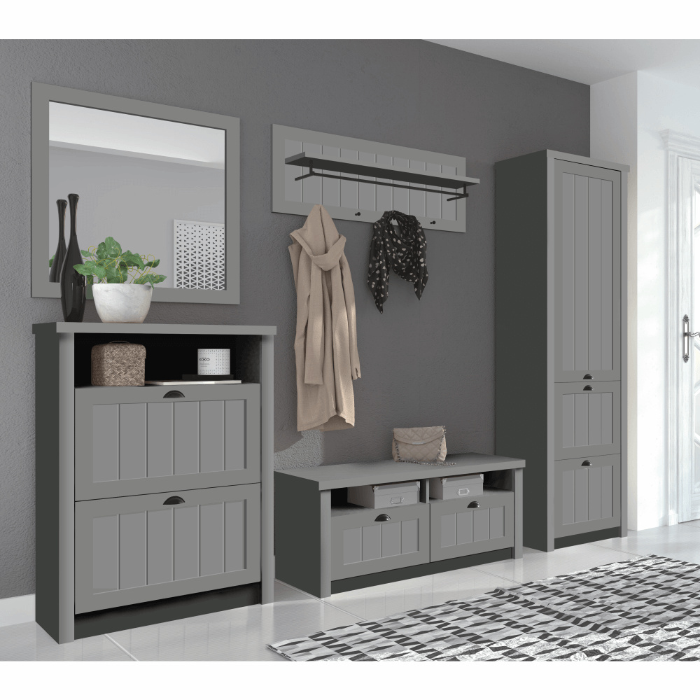 Materiál: DTD laminovaná Barva: šedá Rozměry (ŠxHxV): 109x22x40 cm Tloušťka materiálu korpus: 15 mm Otevřený úložný prostor S policí S věšákovou tyčí S háčky Dodávané v demontu.