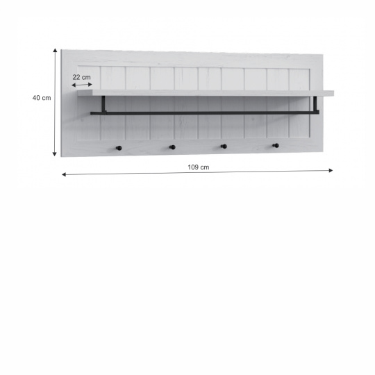 Materiál: DTD laminovaná Barva: sosna andersen Rozměry (ŠxHxV): 109x22x40 cm Tloušťka materiálu korpus: 15 mm Otevřený úložný prostor S policí S věšákovou tyčí S háčky Dodávané v demontu.