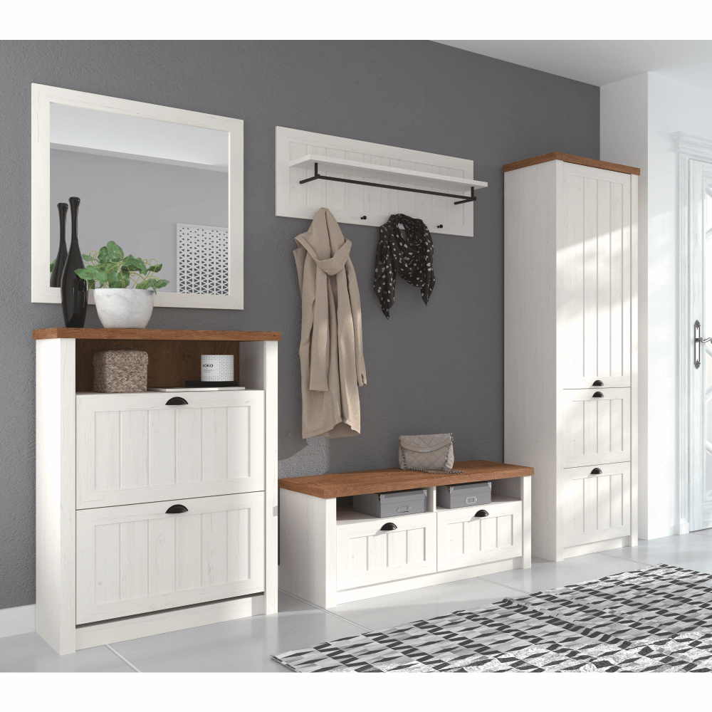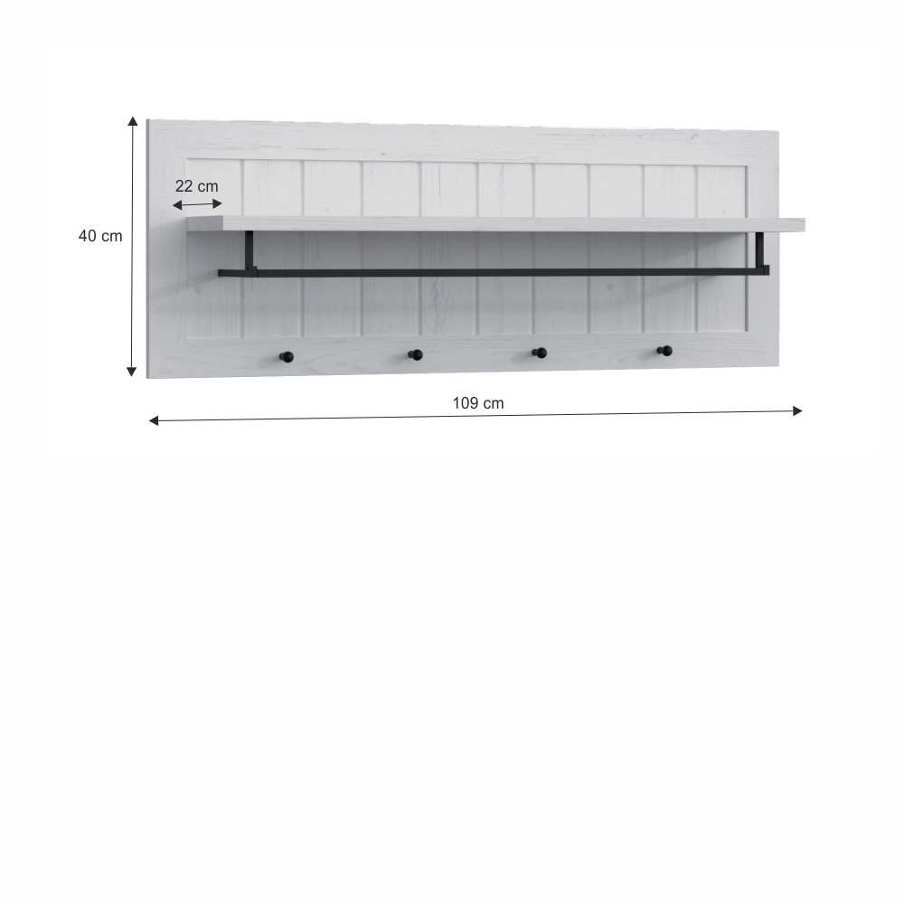 Materiál: DTD laminovaná Barva: sosna andersen Rozměry (ŠxHxV): 109x22x40 cm Tloušťka materiálu korpus: 15 mm Otevřený úložný prostor S policí S věšákovou tyčí S háčky Dodávané v demontu.