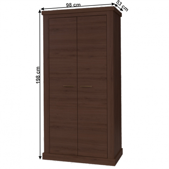 Materiál: DTD laminovaná / ABS hrany Barva: dub stirling Rozměry (ŠxHxV): 98x53x198 cm Tloušťka materiálu: 50 mm 3D efekt kovové úchytky ABS hrany věšáková tyč police Dodávané v demontu