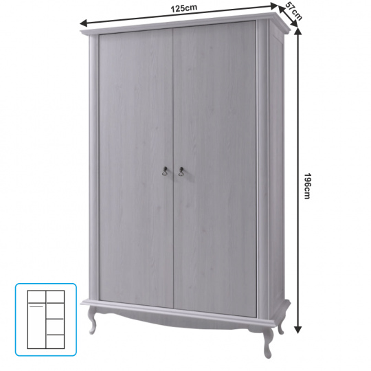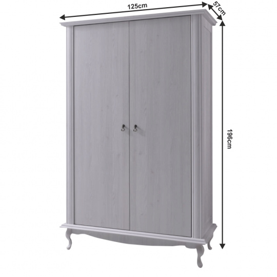 Materiál: DTD laminovaná / ABS hrany Barva: sosna bílá Rozměry (ŠxHxV): 125x57x196 cm Výška spodního prostoru od podlahy: 15 cm Tloušťka materiálu: 30 mm 3D efekt kovové úchytky Dřevěné nožičky ABS hrany