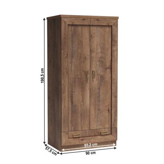 Věšáková skříň TEDY TYP T7 Materiál: laminovaná DTD/fóliovaná MDF/kov/sklo Barva: dub lefkas Rozměry (ŠxHxV): 90x57x190 cm Tloušťka materiálu: 32 mm Tloušťka materiálu zbývající části: 16 mm ABS hrany Rustikální styl Ozdobné lišty Kovové úchytky Dva šuplíky věšáková s věšákovou tyčí Dodáváno v demontu