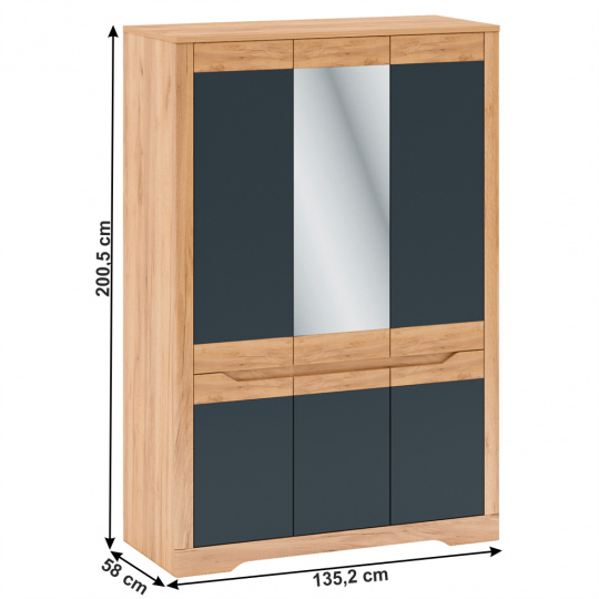 Materiál: DTD laminovaná / MDF fóliovaná Barva: dub craft zlatý /grafit šedá Rozměry (ŠxHxV): 135,2x58x200,5 cm Tloušťka materiálu korpus: 16 mm Tloušťka materiálu vrchní deska: 22 mm police věšáková tyč zrcadlo Dodávané v demontu