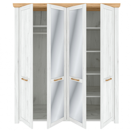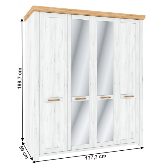 Materiál: DTD laminovaná / MDF laminovaná Barva: dub craft zlatý / dub craft bílý Rozměry (ŠxHxV): 177,7x59x199,7 cm Tloušťka materiálu korpus: 16 mm Tloušťka materiálu vrchní deska: 22 mm Tloušťka materiálu dvířka: 19 mm Výška spodního prostoru od podlahy je 4,2 cm se zrcadlem čtyřdveřová věšáková tyč police Dodávané v demontu