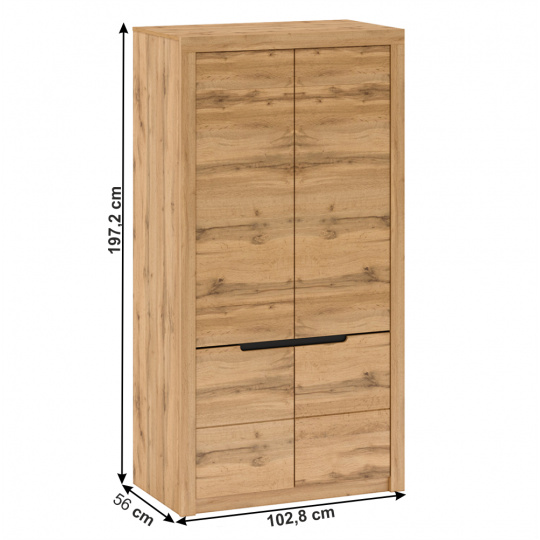 Materiál: DTD laminovaná / MDF fóliovaná Barva: dub wotan Rozměry (ŠxHxV): 102,8x56x197,2 cm Tloušťka materiálu korpus: 16 mm čtyřdveřová věšáková S věšákovou tyčí S policí Dodávané v demontu.