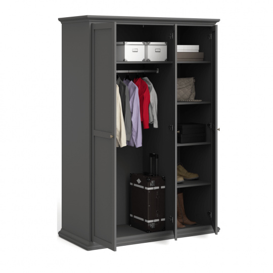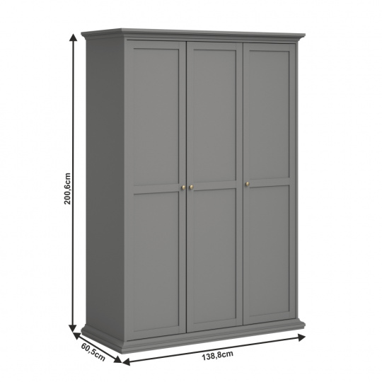 Materiál: DTD laminovaná/MDF lakovaná Barva: šedá Rozměry (ŠxHxV): 138,8x60,5x200,6 cm Tloušťka materiálu: 18 mm Třídveřová Věšáková S věšákovou tyčí Policová Kovové úchytky Provensálský styl Ozdobné lišty Dodáváno v demontu.