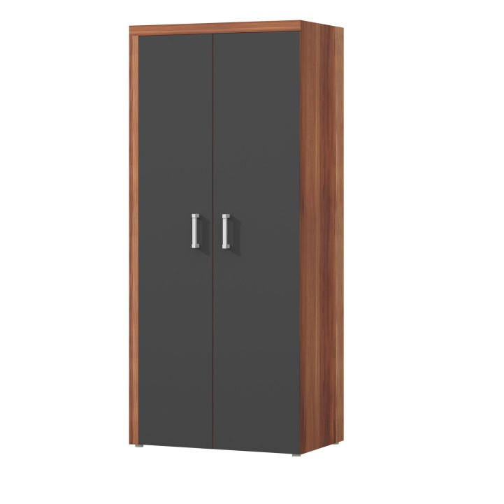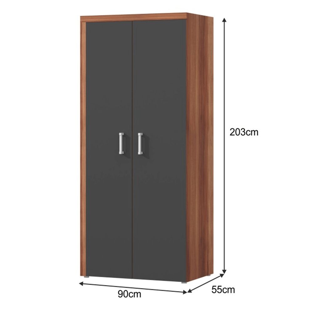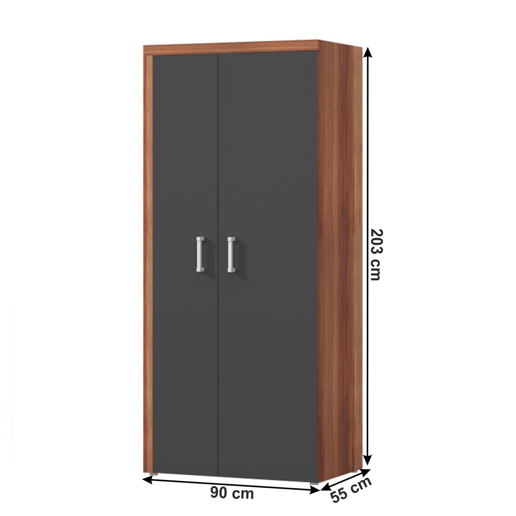 Materiál: DTD laminovaná Barva: švestka/šedý grafit Rozměry (ŠxHxV): 90x55x203 cm Tloušťka materiálu: 16 mm 2-dveřová Police Věšáková tyč Dodáváno v demontu