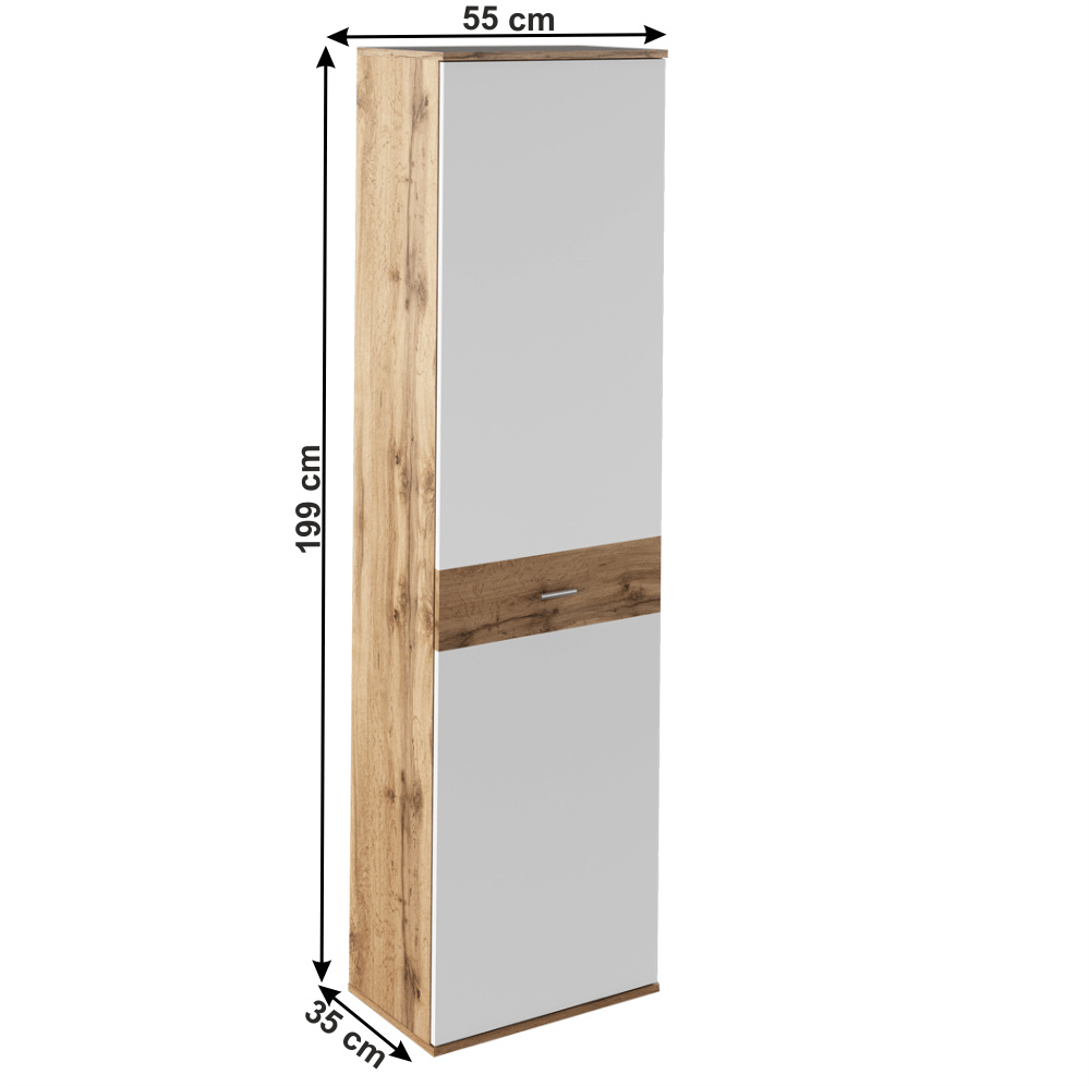 Materiál: DTD laminovaná Barva: dub Wotan / bílá Rozměry (ŠxHxV): 55x35x199 cm věšáková jednodveřová S věšákovou tyčí S 2 policemi S úchytkou Kvalitní slovenský výrobek Dodávané v demontu