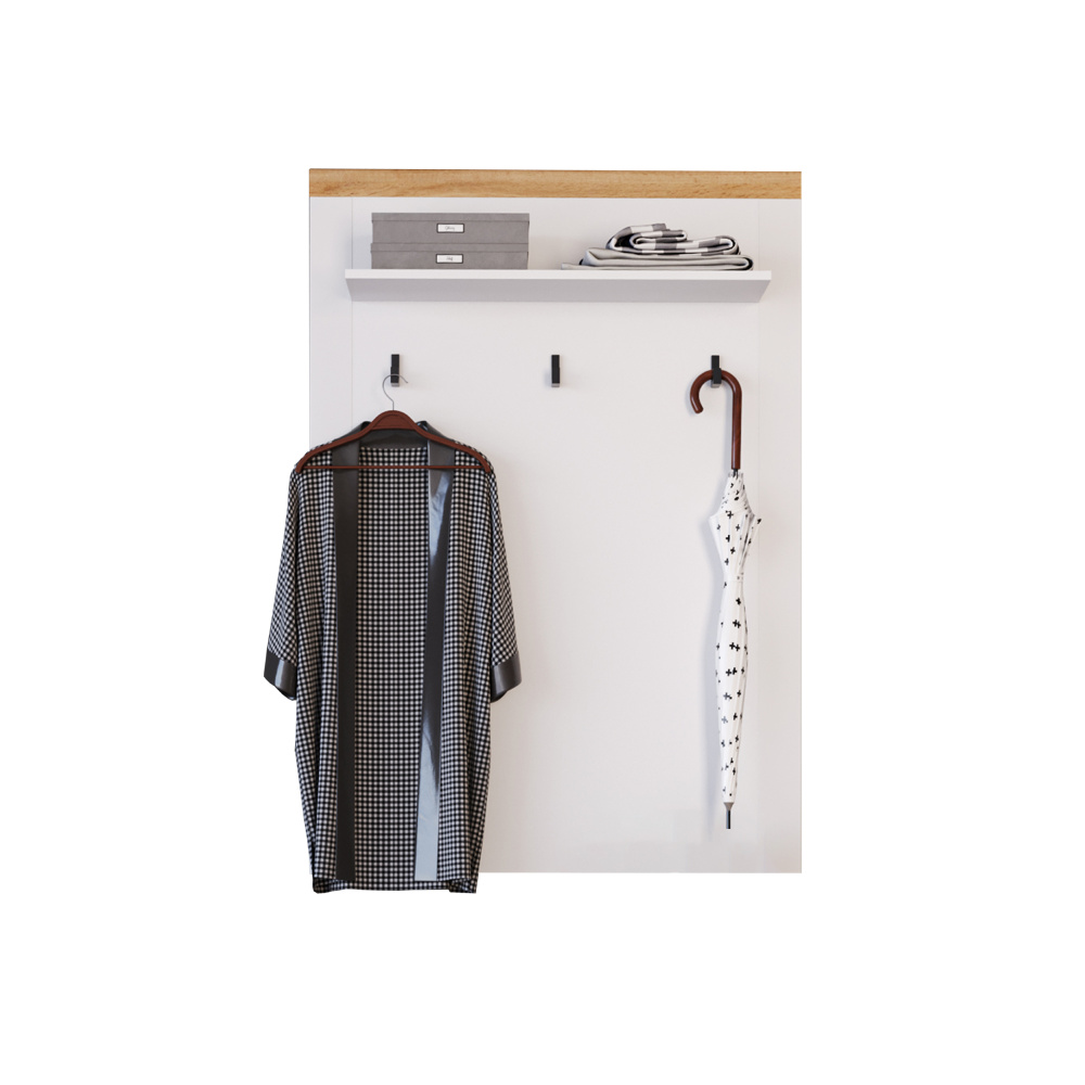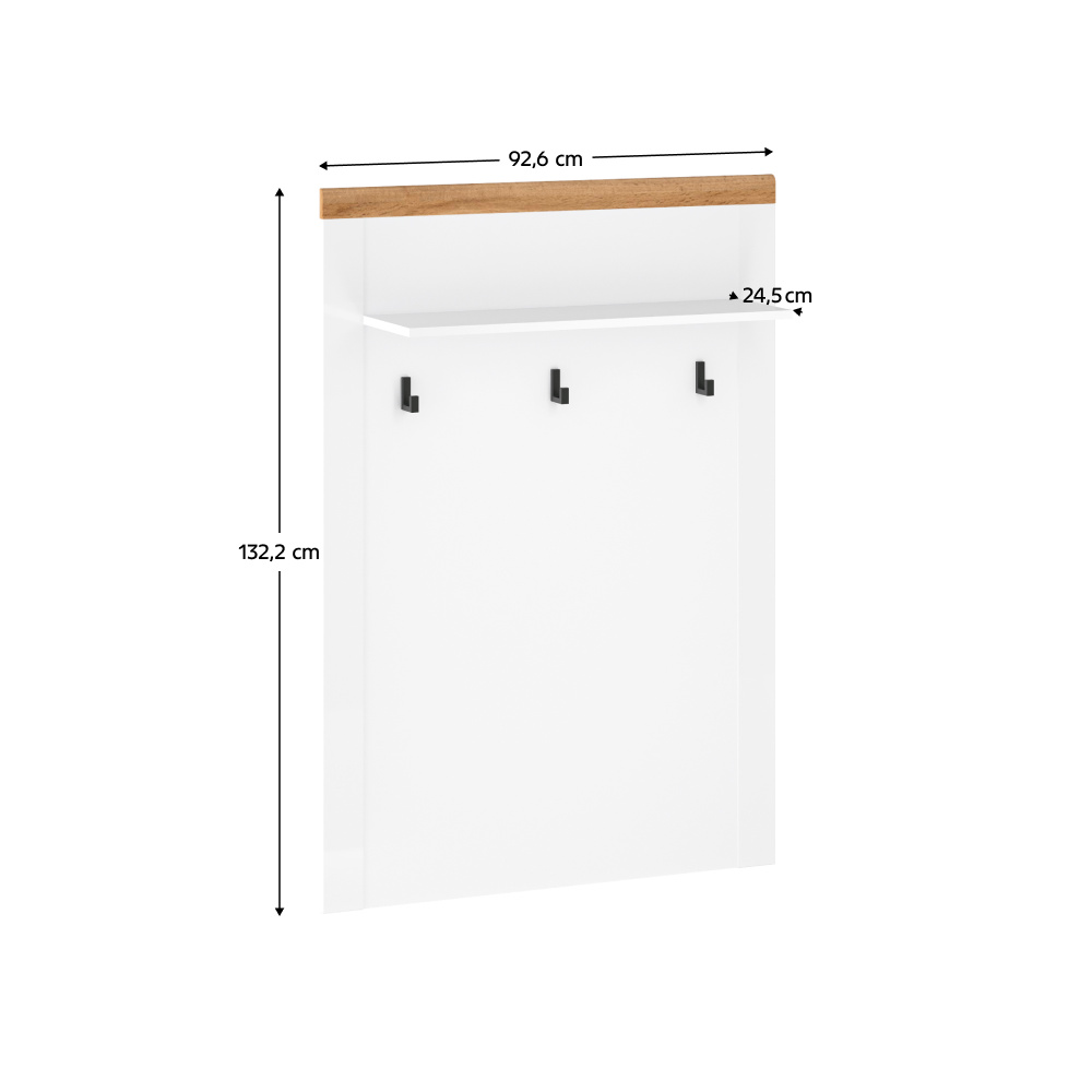 Materiál: DTD laminovaná/ABS hrany Barva: bílá/dub wotan Rozměry (ŠxHxV): 92,6x24,5x132,2 cm Tloušťka materiálu: 1,6 - 2,2 cm S policí Tři háčky Doporučujeme připevnit ke zdi Jen na objednávku Dodací lhůta je 3-5 týdnů Dodáváno v demontu