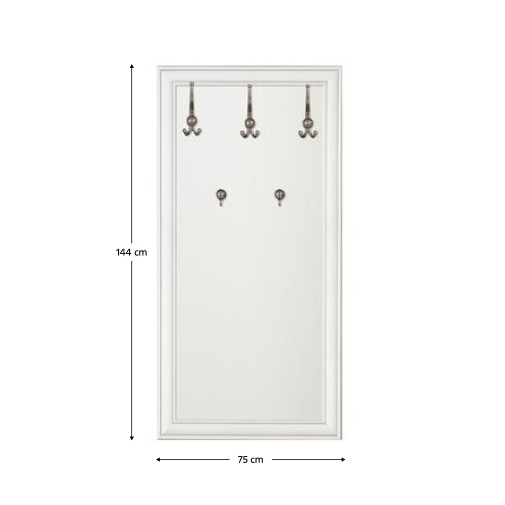 Materiál: DTD laminovaná Barva: alpská bílá Rozměry (ŠxHxV): 75x3x144 cm Tloušťka materiálu: 1,6 cm Kovové háčky Barva háčků: antické stříbro Nosnost háčku: 5 kg Dodáváno v demontu