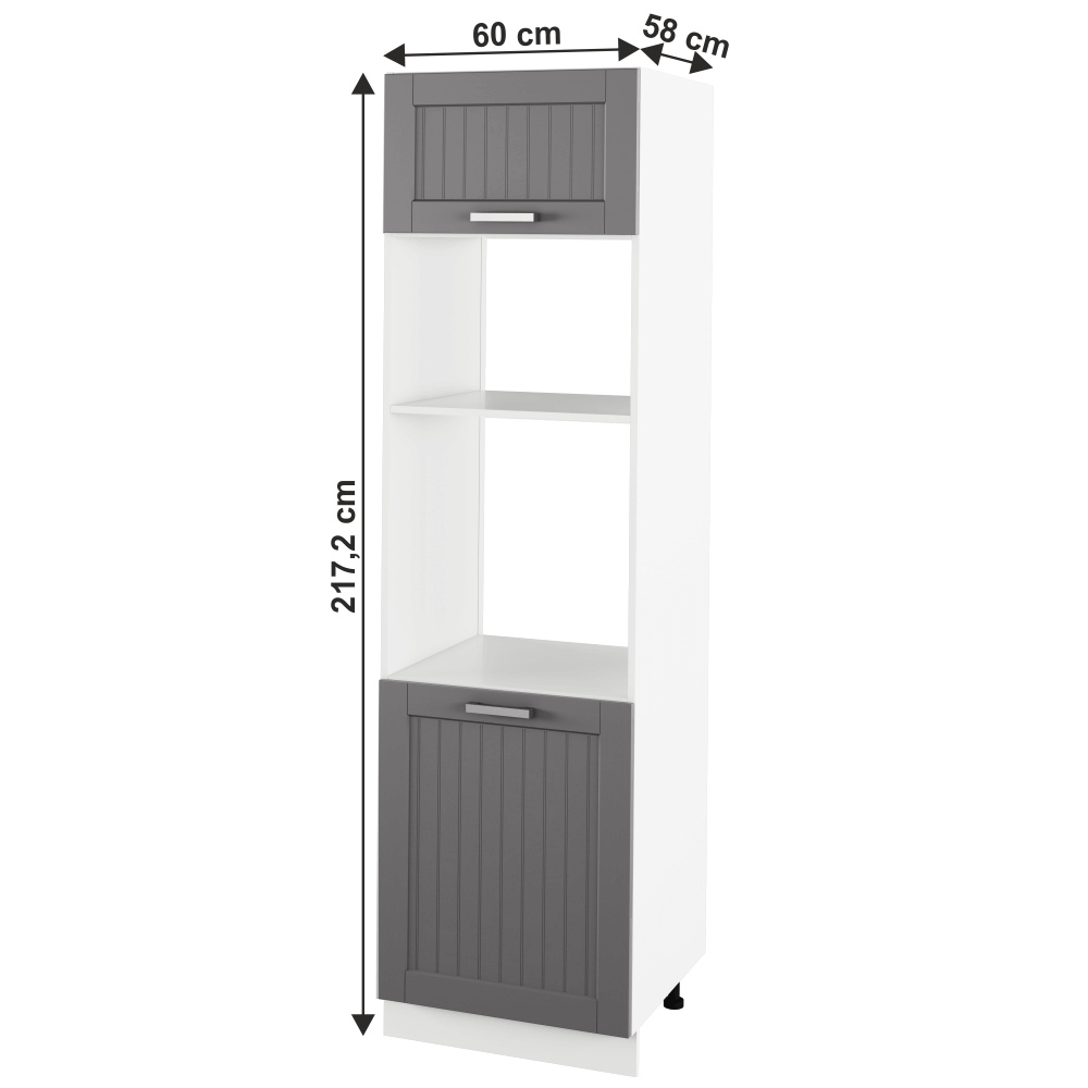 Materiál skříňka: DTD laminovaná / MDF fóliovaná Barva skříňka: tmavě šedá / bílá Materiál úchytky: kov Barva úchytky: matný chrom Rozměry (ŠxHxV): 60x58x217,2 cm Vnitřní rozměr na trubku (ŠxHxV): 56,8x56,5x59 cm Vnitřní rozměr na mikrovlnku (ŠxHxV): 56,8x56,5x38 cm Tloušťka materiálu: 16 mm S dvířky S nožičkami S kovovými úchyty Kvalitní slovenský výrobek Dodávané v demontu Cena sektorových skříněk je včetně soklů, bez pracovní desky. Cena za pracovní desku je 1.390,-Kč za bm - tloušťka 38 mm.