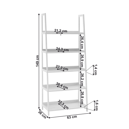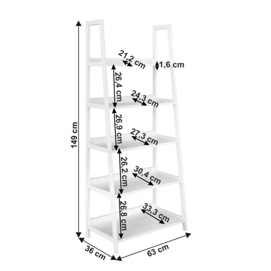 Víceúčelový regál Reon TYP 3 Materiál: MDF / bambus lakovaný Barva: bílá Rozměry (ŠxHxV): 63x63x149 cm Tloušťka materiálu stojan: 1,4 cm Tloušťka materiálu police: 1,6 cm Nosnost na jednu polici: 5 kg 5 polic Hloubka vrchní police: 21,2 cm Hloubka 2. police: 24,3 cm Hloubka 3. police: 27,3 cm Hloubka 4. police: 30,4 cm Hloubka spodní police: 33,3 cm Prostor mezi vrchní a 2. policí: 26,4 cm Prostor mezi 2. a 3. policí: 26,9 cm Prostor mezi 3. a 4. policí: 26,2 cm Prostor mezi 4. a spodní policí: 26,8 cm moderní design praktický Dodávané v demontu.