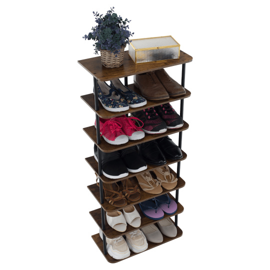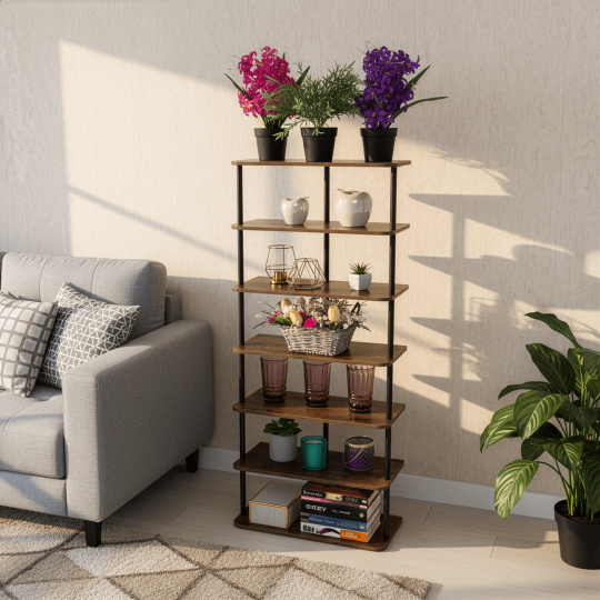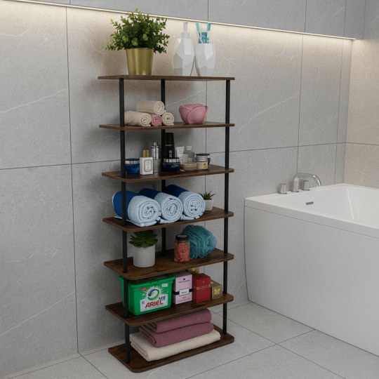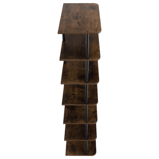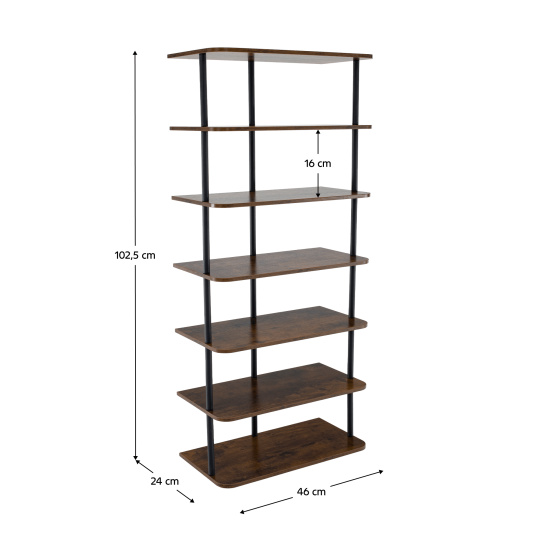 Materiál: kov/DTD Barva: černá/rustikální dřevo Rozměry (ŠxHxV): 46x24x102,5 cm Tloušťka tyče: 1,6 cm Nosnost na polici: 5 kg-10 kg Výška police: 16 cm 6-řadý Víceúčelový Dodáváno v demontu
