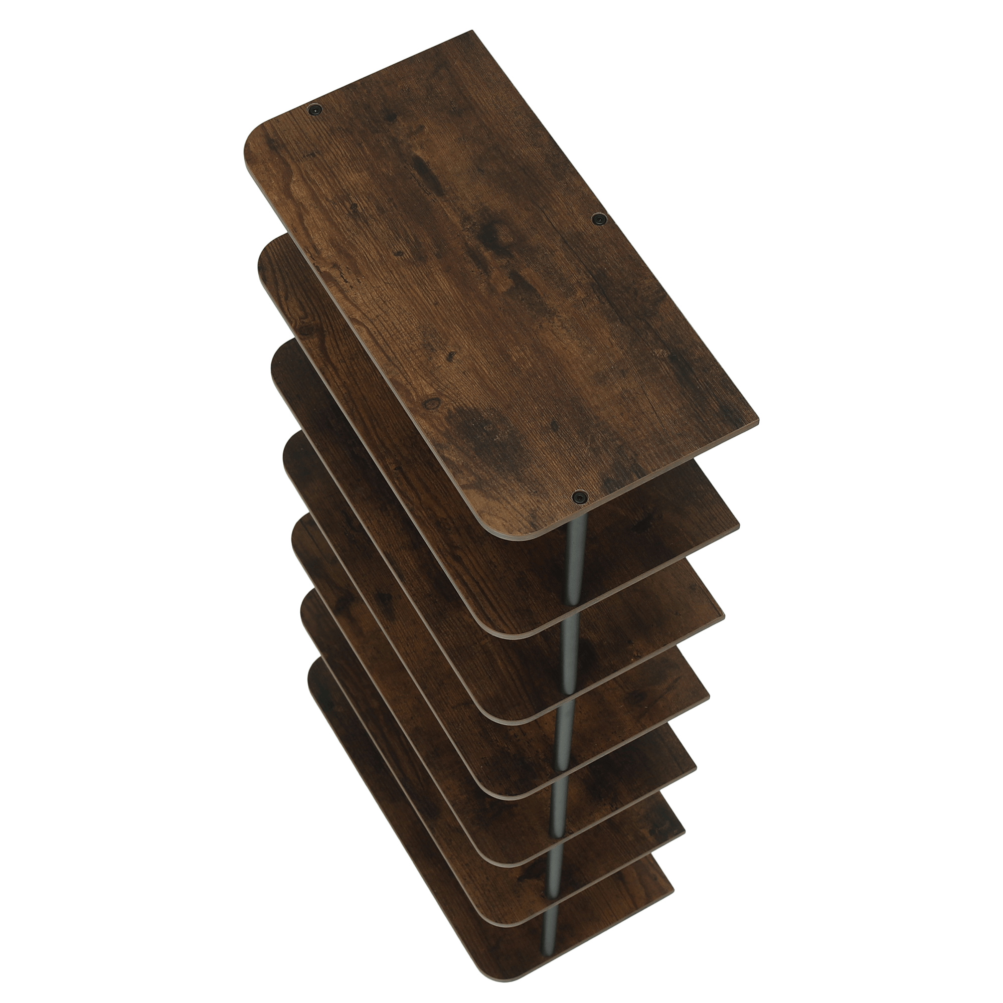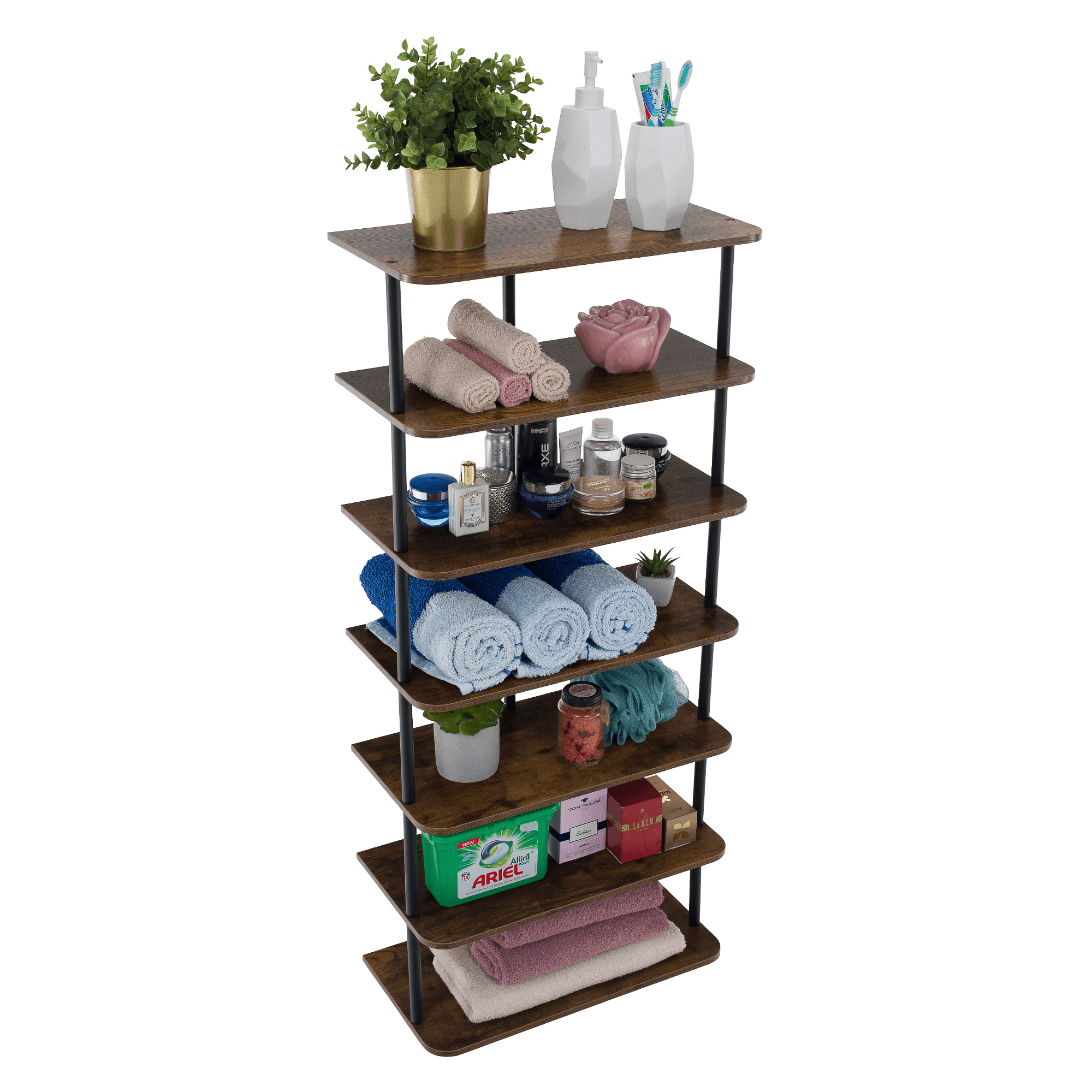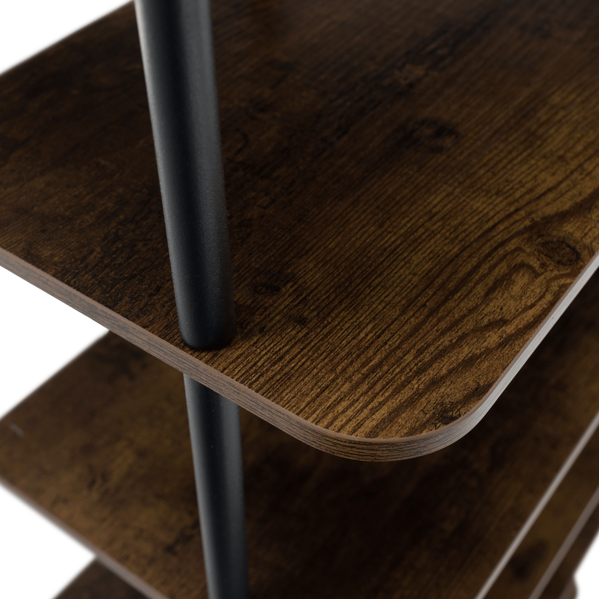 Materiál: kov/DTD Barva: černá/rustikální dřevo Rozměry (ŠxHxV): 46x24x102,5 cm Tloušťka tyče: 1,6 cm Nosnost na polici: 5 kg-10 kg Výška police: 16 cm 6-řadý Víceúčelový Dodáváno v demontu