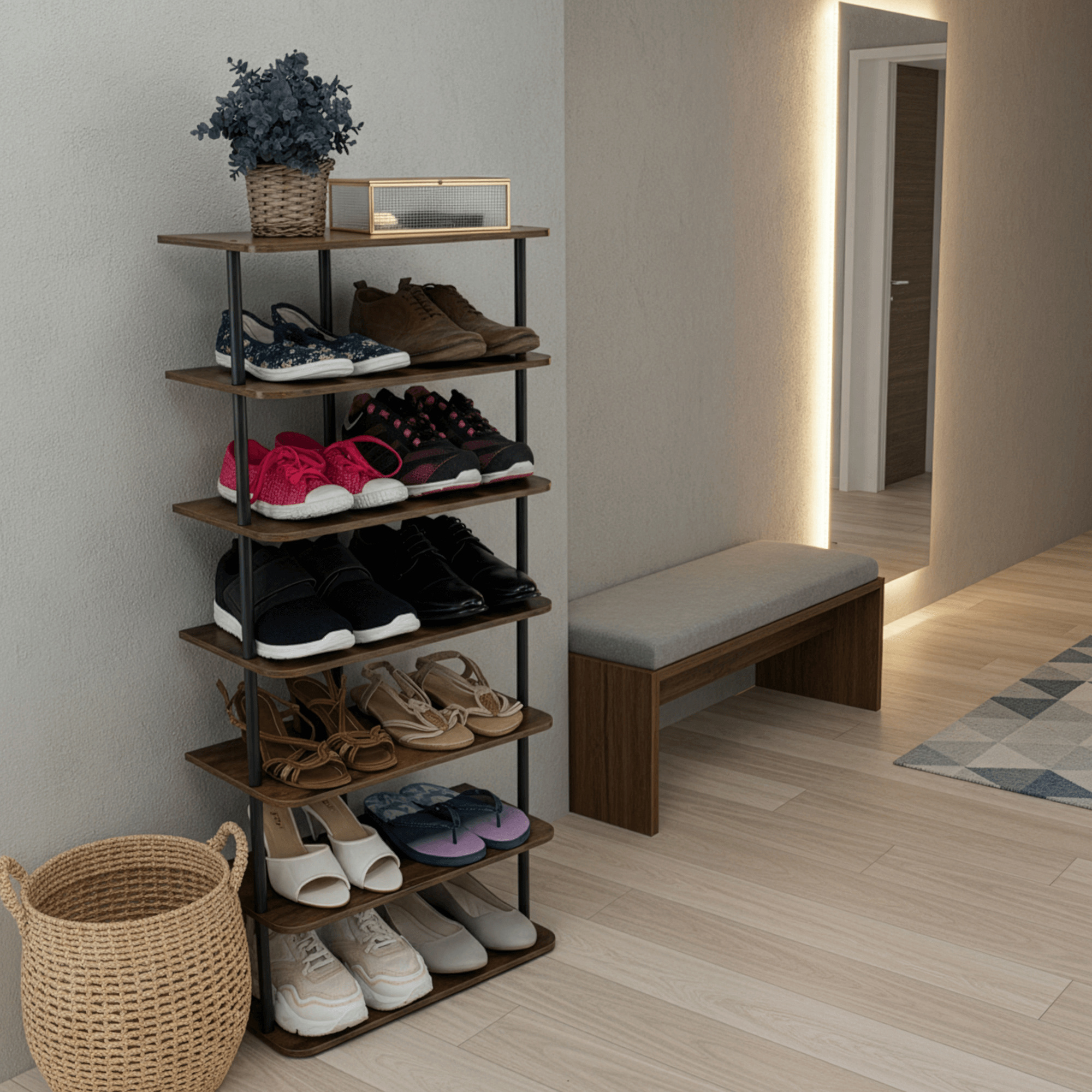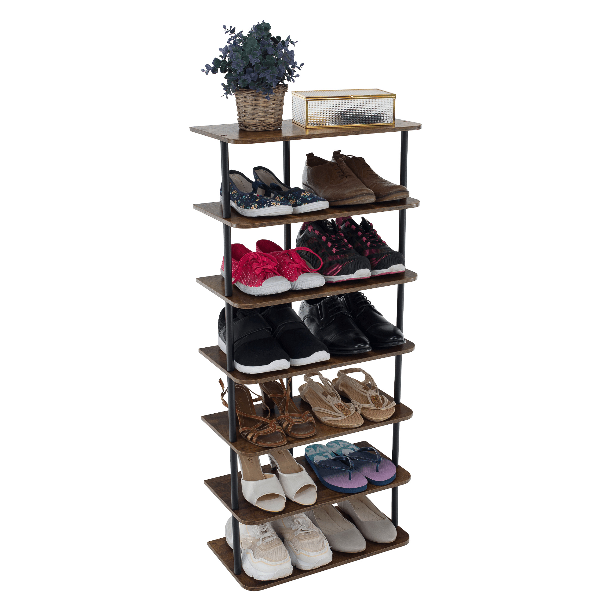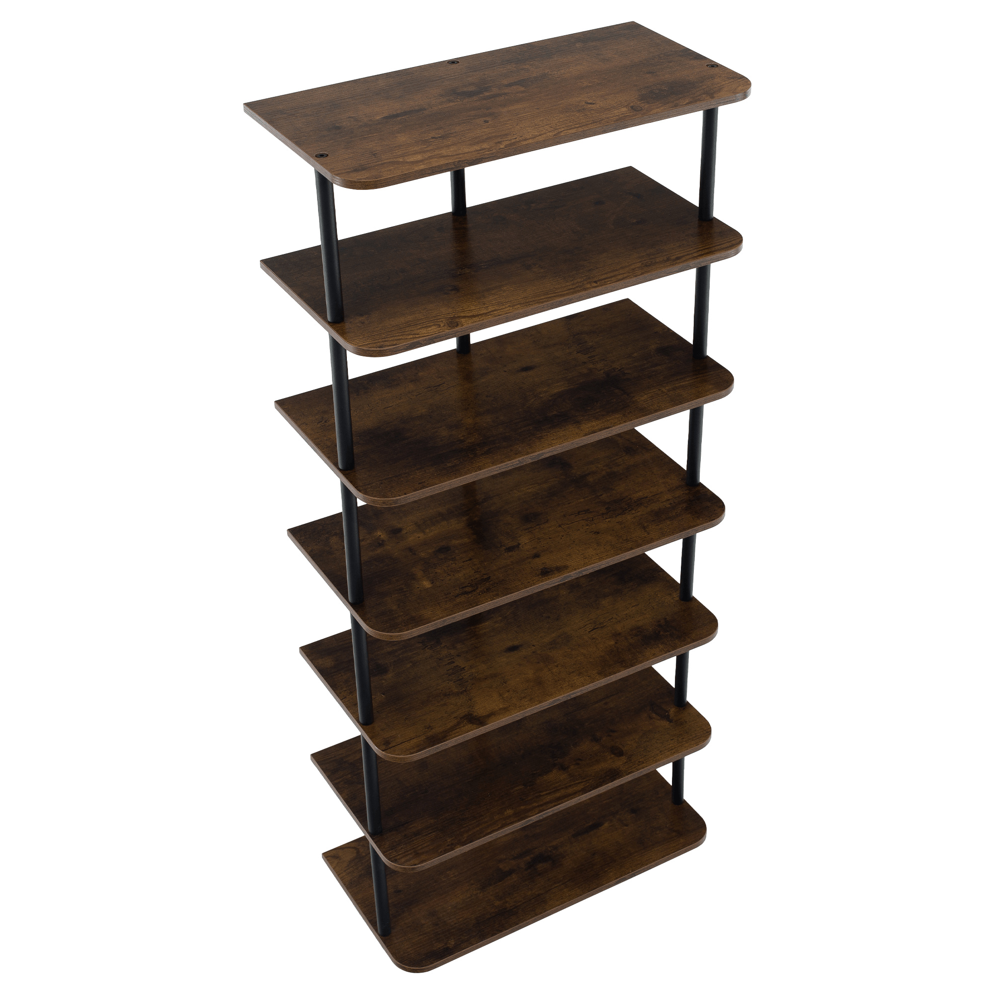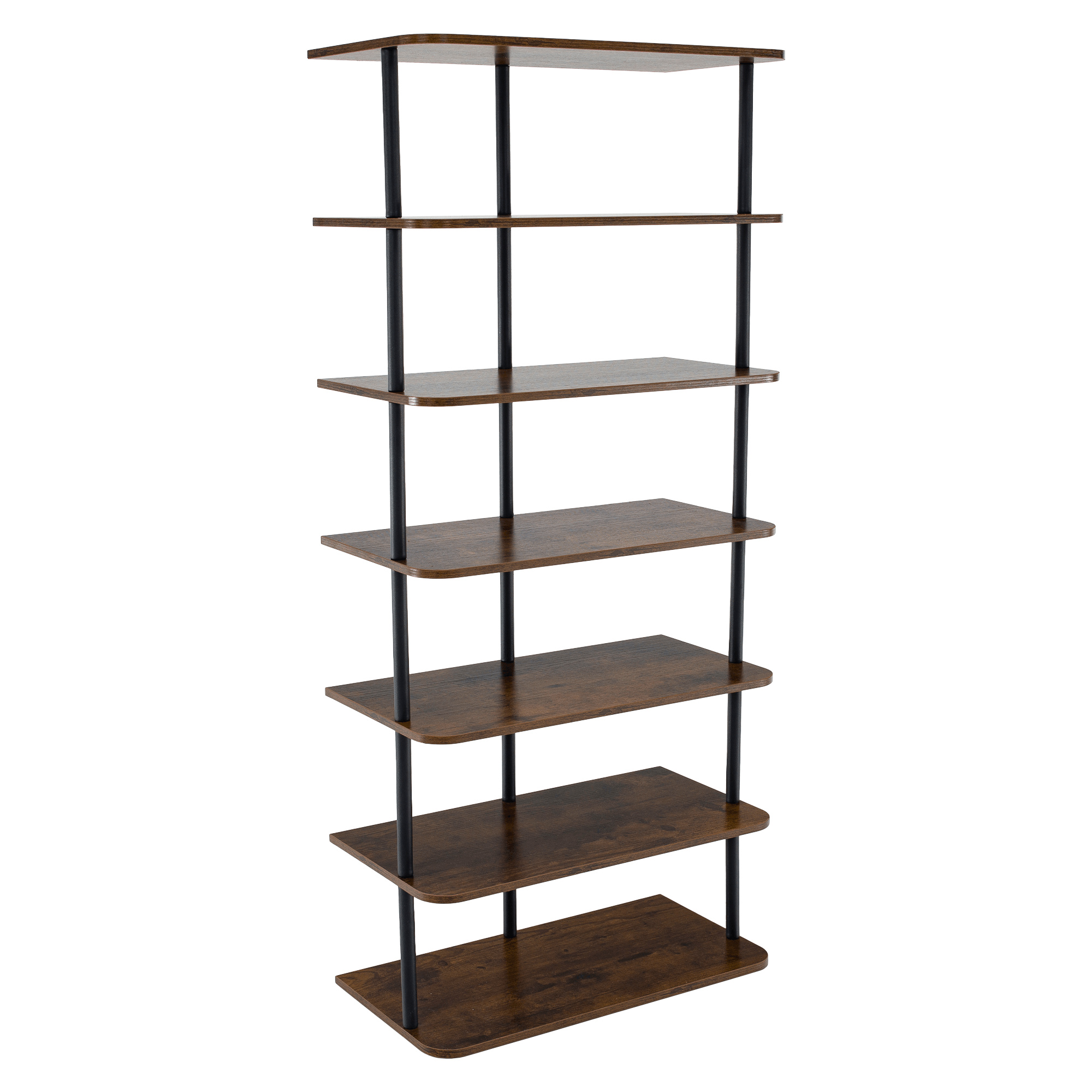 Materiál: kov/DTD Barva: černá/rustikální dřevo Rozměry (ŠxHxV): 46x24x102,5 cm Tloušťka tyče: 1,6 cm Nosnost na polici: 5 kg-10 kg Výška police: 16 cm 6-řadý Víceúčelový Dodáváno v demontu