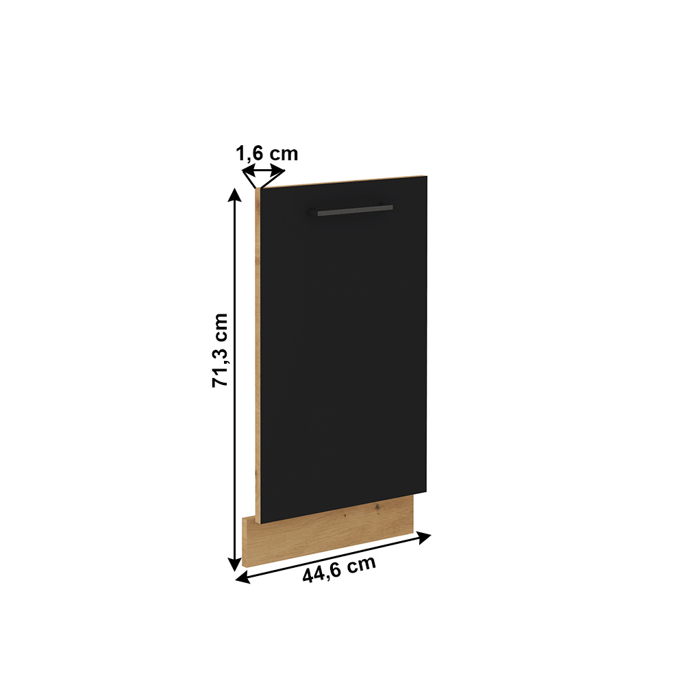 Materiál: laminovaná DTD Barva: černý mat / dub artisan Rozměry (ŠxHxV): 44,6x1,6x71,3 cm Dvířka na vestavnou myčku nádobí S úchytkou Úchytka: 19,2 cm S dolní lištou / soklem Moderní dynamický design Dodávané v demontu Možnost dokoupení pracovní desky dub artisan v ceně: 1 890 Kč/m Možnost t dokoupení univerzálního P / Ľ dřezu LAY ON.