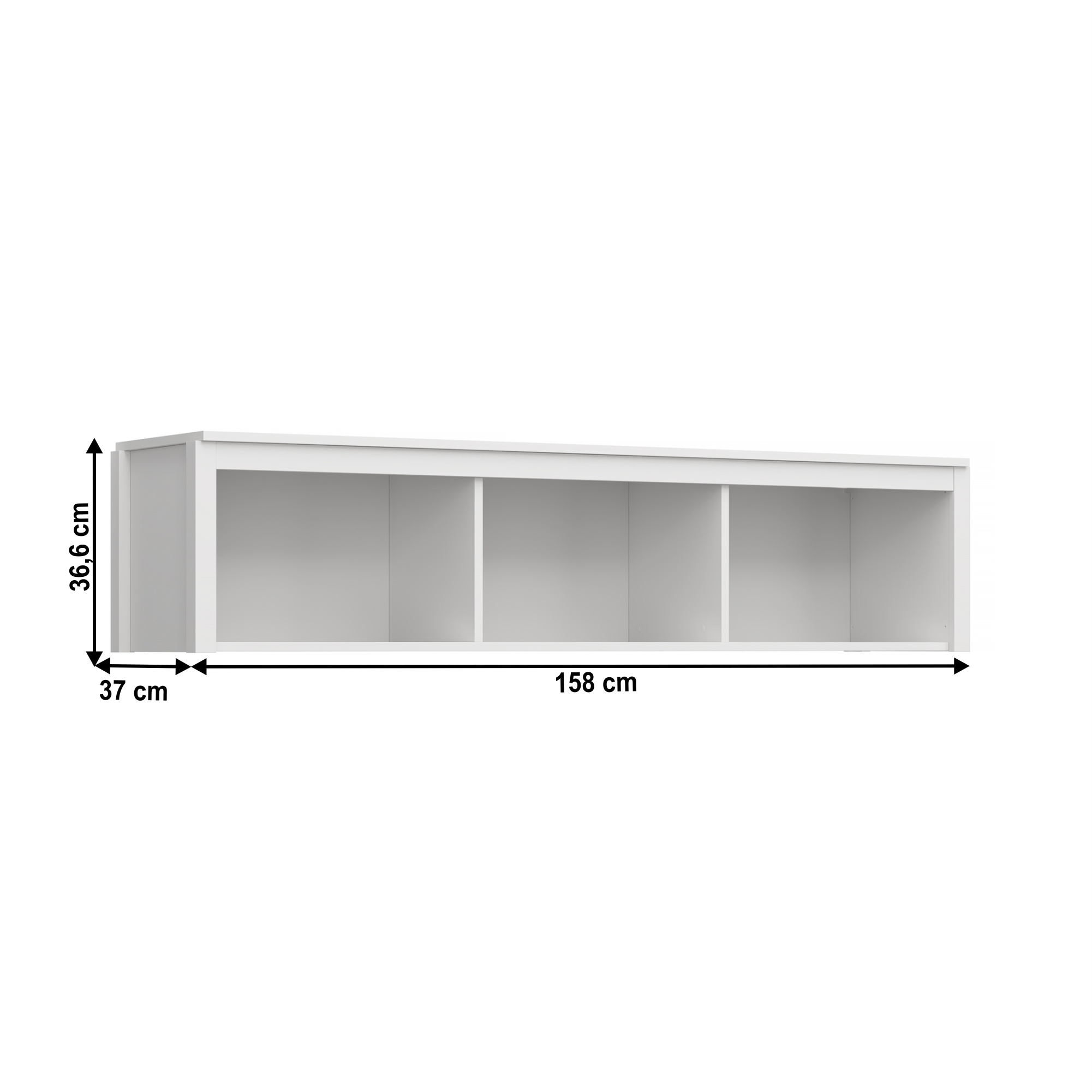 Materiál: DTD laminovaná/ABS hrany Barva: bílá Rozměry (ŠxHxV): 158x37x36,6 cm Tloušťka materiálu: 1,6 cm Otevřený úložný prostor Předělený úložný prostor Spodní a vrchní lišta Tři odkládací části ABS hrany Bez LED osvětlení Možnost dokoupení LED osvětlení Dodáván v demontu