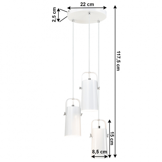 Materiál: kov Barva: bílá Celkové rozměry (ŠxHxV): 26,3x24,3x117,5 cm Rozměry stínítka (ŠxHxV): 8,5x8,5x15 cm Dodávána bez žárovky visící Doporučený typ žárovky (závit): E14 Maximální příkon žárovky: 25 W Napětí: 220-240 V Délka kabelu: 1m Dodávané v demontu