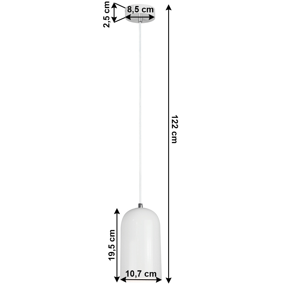 Materiál: kov Barva: bílá Celkové rozměry (ŠxHxV): 10,7x10,7x122 cm Rozměry stínítka (ŠxHxV): 10,7x10,7x19,5 cm Rozměry rozety: (ŠxHxV): 8,5x8,5x2,5 cm Dodávána bez žárovky Visící, stropní svítidlo Doporučený typ žárovky (závit): E27 Maximální příkon žárovky: 40 W Napětí: 220-240 V Moderní minimalistický design Dodávané v demontu