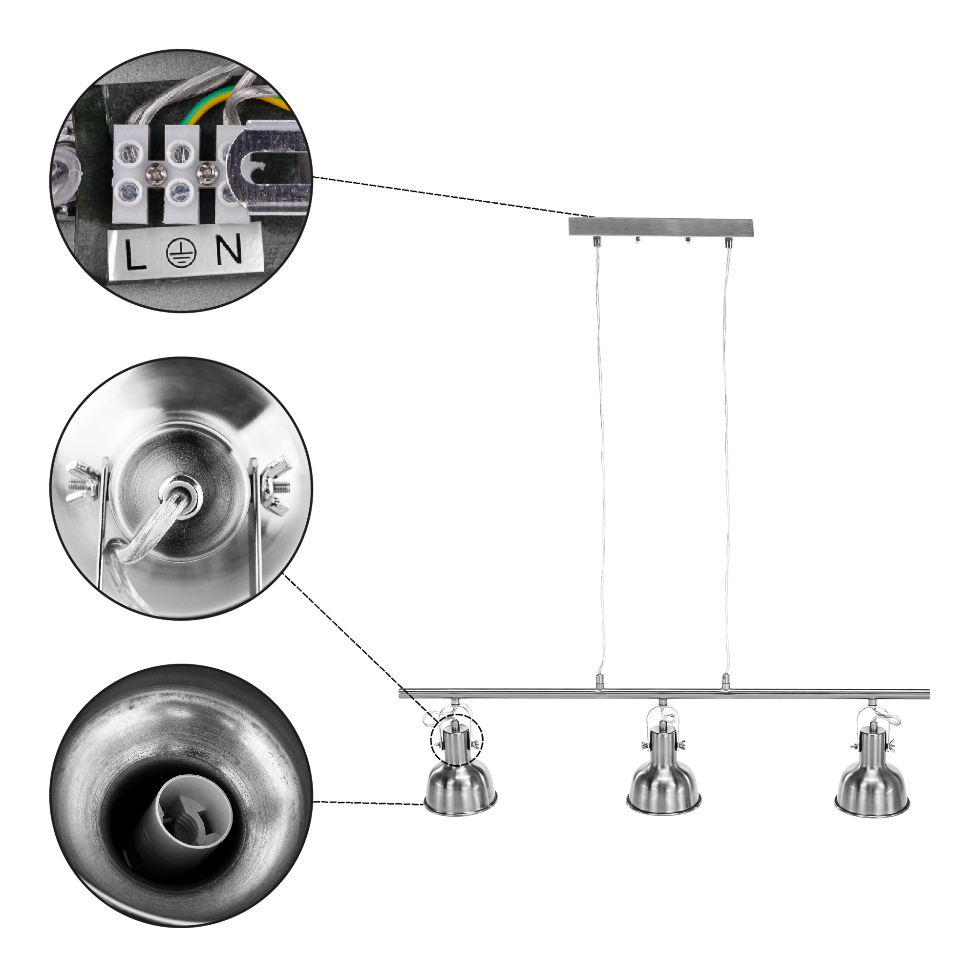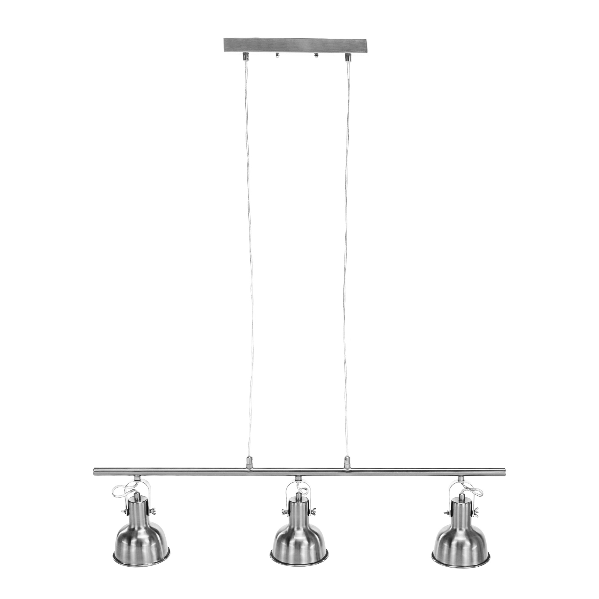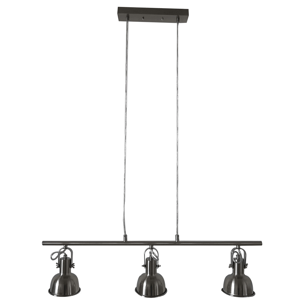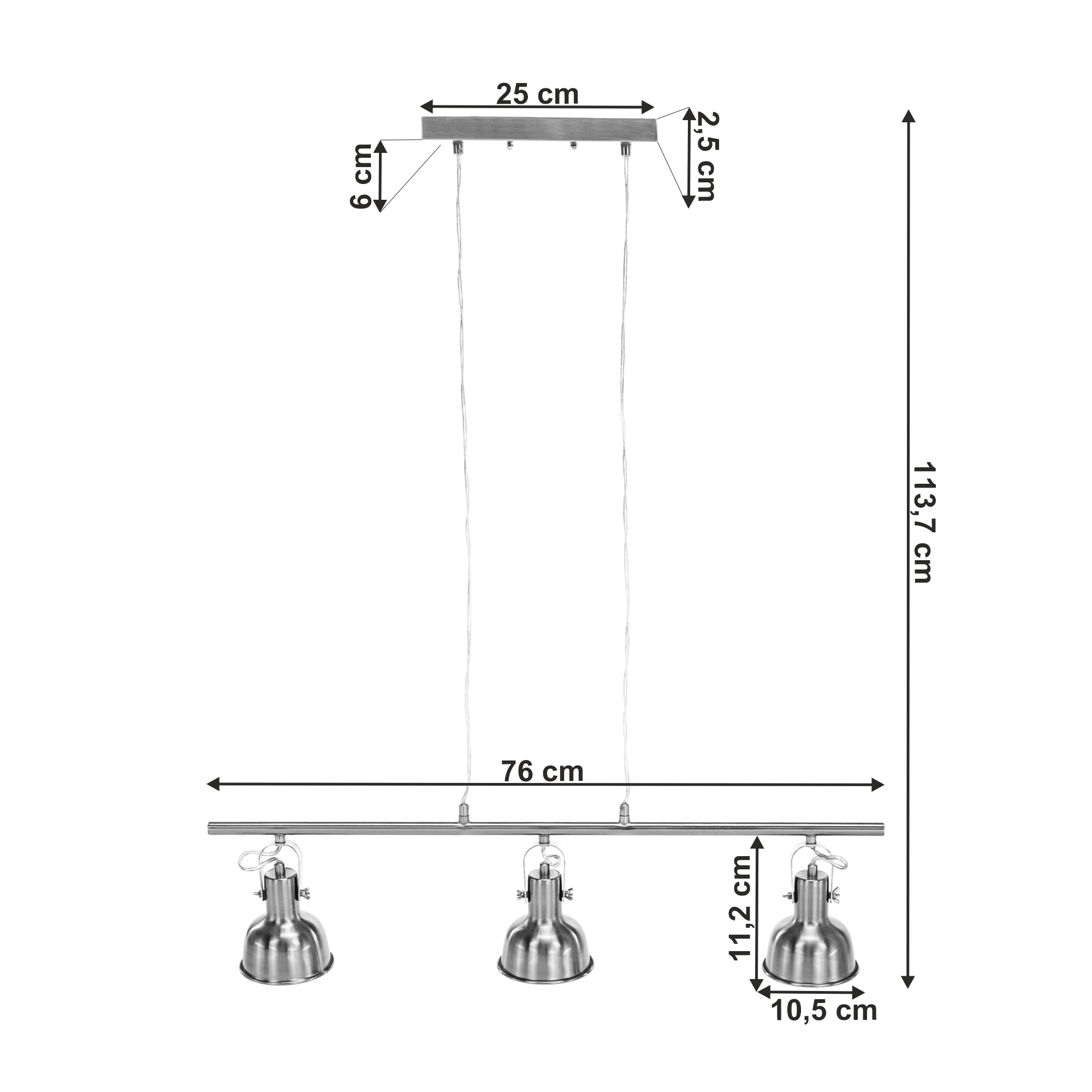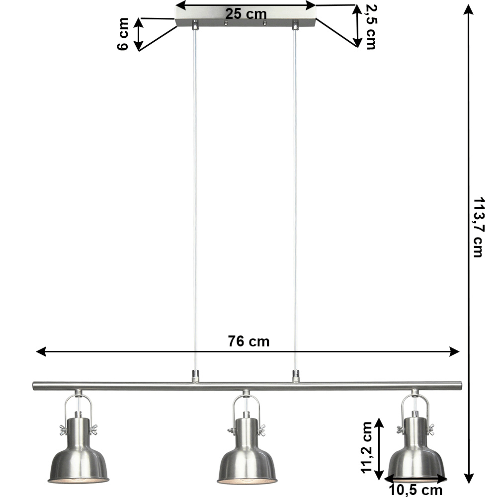 Materiál: kov Barva: matný nikl Celkové rozměry (ŠxHxV): 76,5x10,5x113,7cm Rozměry stínítka (ŠxHxV): 10,5x10,5x11,2 cm Rozměry rozety (ŠxHxV): 25x6x2,5 cm Doporučený typ žárovky (závit): E14 Maximální příkon žárovky: 25 W Napětí: 220-240 V S třemi světly Elegantní a moderní všestranná Dodávána bez žárovky Dodávané v demontu