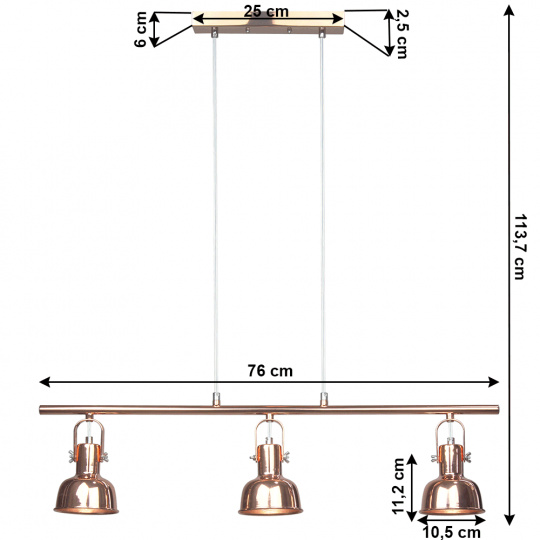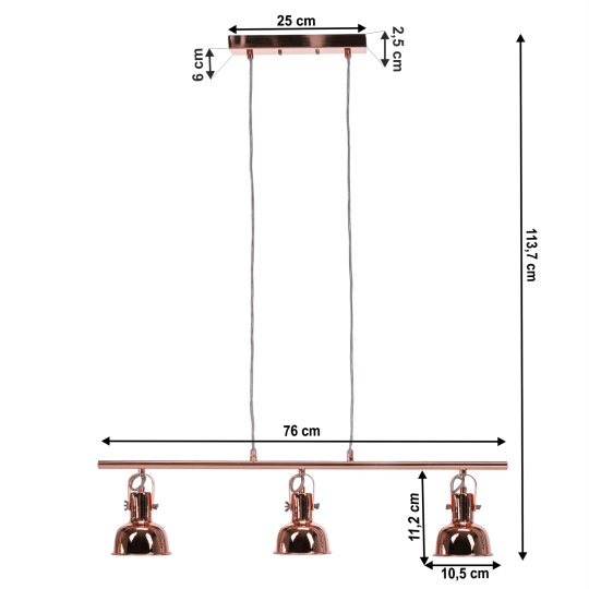 Materiál: kov Barva: rose gold Celkové rozměry (ŠxHxV): 76,5x10,5x113,7cm Rozměry stínítka (ŠxHxV): 10,5x10,5x11,2 cm Rozměry rozety (ŠxHxV): 25x6x2,5 cm Doporučený typ žárovky (závit): E14 Maximální příkon žárovky: 25 W Napětí: 220-240 V S třemi světly Elegantní a moderní všestranná Dodávána bez žárovky Dodávané v demontu